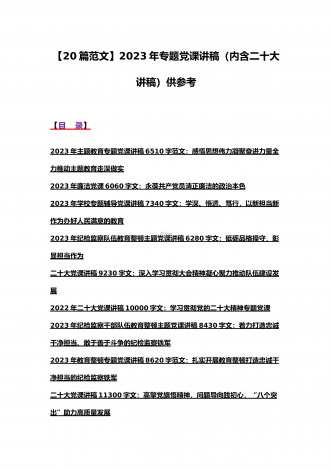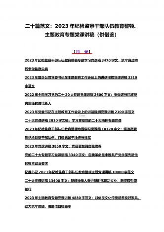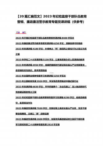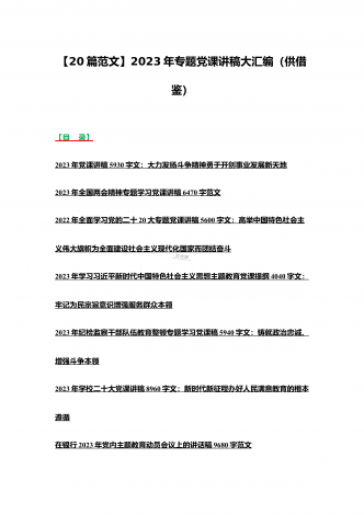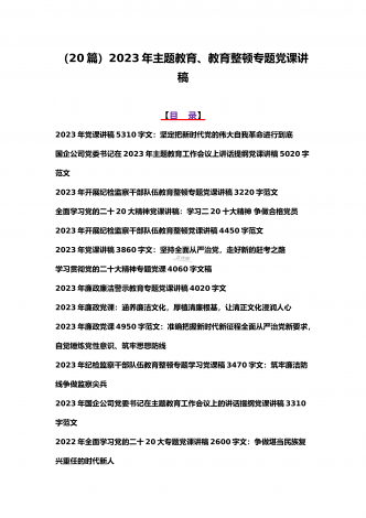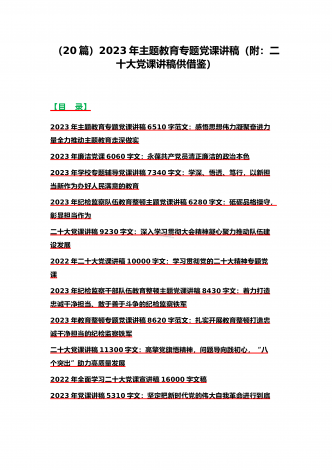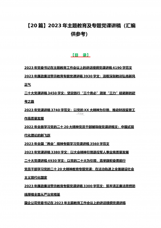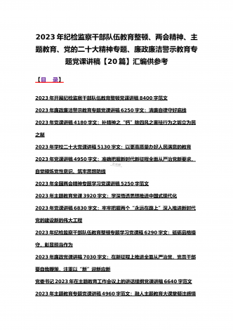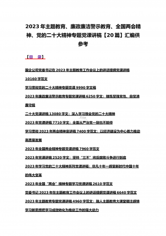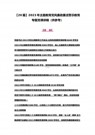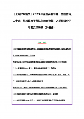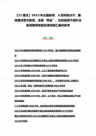 2023年主题教育、入党积极分子、全国“两会”、纪检监察干部队伍教育整顿、廉政廉洁警示教育、党的二十大精神专题党课讲稿【21篇文】汇编供参考【目录】党委书记2023年在主题教育工作会议上的讲话提纲党课讲稿6640字范文2023年主题教育专题党课讲稿4960字范文:融人主题教育大课堂倾注感情学习新思想把学习成效转化为推动工作的强大动力2023年主题教育专题党课讲稿3380字文:自觉做习近平新时代中国特色社会主义思想的坚定信仰者和忠实实践者2023年廉政党课讲稿6180字文:坚持自我革命提高一体推进...