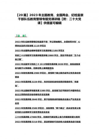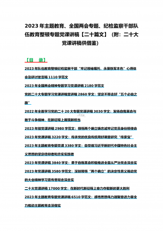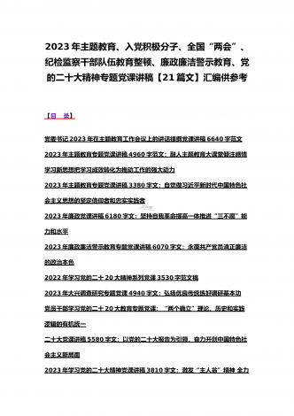 2023年主题教育、入党积极分子、全国“两会”、纪检监察干部队伍教育整顿、廉政廉洁警示教育、党的二十大精神专题党课讲稿【21篇文】汇编供参考