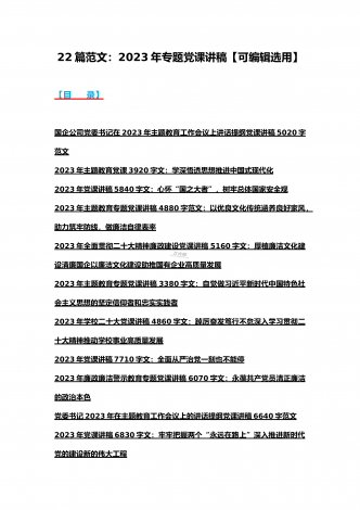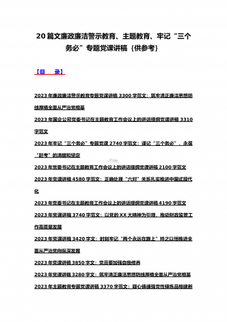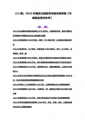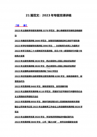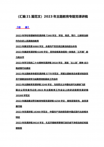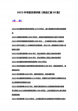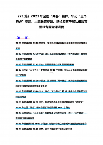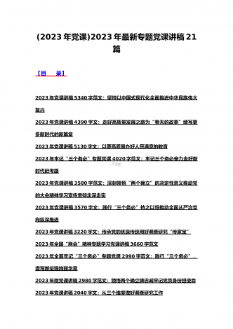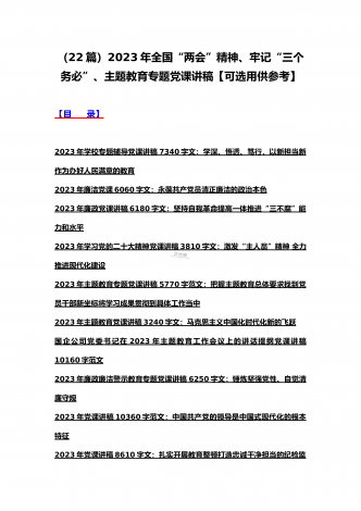(汇编21篇)2023年全国“两会”精神、牢记“三个务必”主题教育、党风廉政、入党积极分子、纪检监察干部队伍教育整顿专题党课讲稿【可编辑选用供参考】【目录】2023年党课讲稿5340字范文:坚持以中国式现代化全面推进中华民族伟大复兴2023年党课讲稿4390字文:走好高质量发展之路为“春天的故事”续写更多新时代的新篇章2023年党课讲稿5130字文:以更高质量办好人民满意的教育2023年牢记“三个务必”专题党课:牢记三个务必奋力走好新时代赶考路2023年党课讲稿3580字范文:深刻领悟“两个确立...