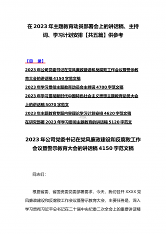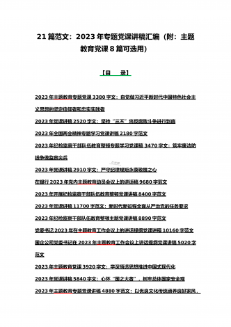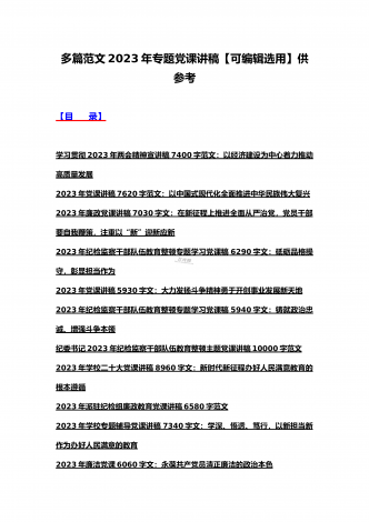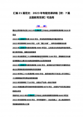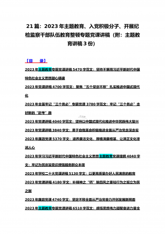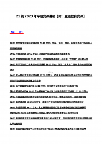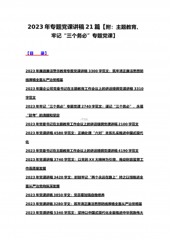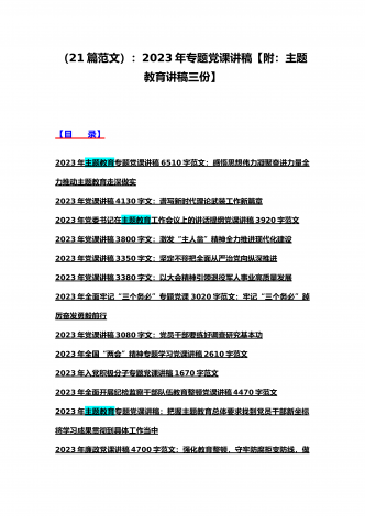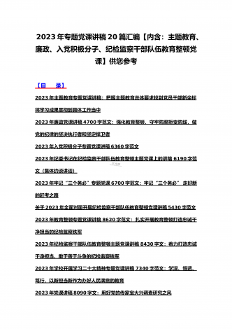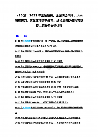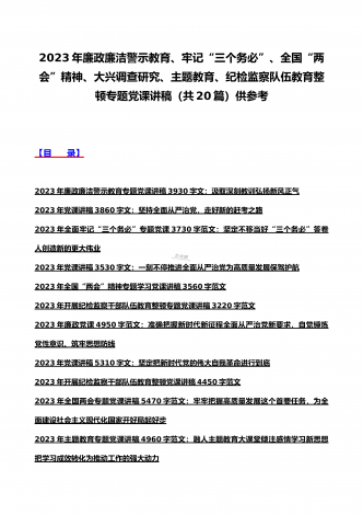 2023年廉政廉洁警示教育、牢记“三个务必”、全国“两会”精神、大兴调查研究、主题教育、纪检监察队伍教育整顿专题党课讲稿(共20篇)供参考【目录】2023年廉政廉洁警示教育专题党课讲稿3930字文:汲取深刻教训弘扬新风正气2023年党课讲稿3860字文:坚持全面从严治党,走好新的赶考之路2023年全面牢记“三个务必”专题党课3730字范文:坚定不移当好“三个务必”答卷人创造新的更大伟业2023年党课讲稿3530字文:一刻不停推进全面从严治党为高质量发展保驾护航2023年全国“两会”精神专题学习党...