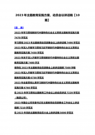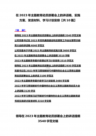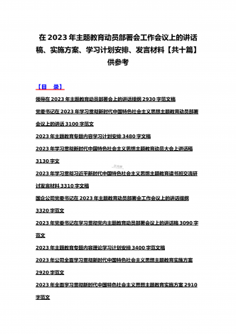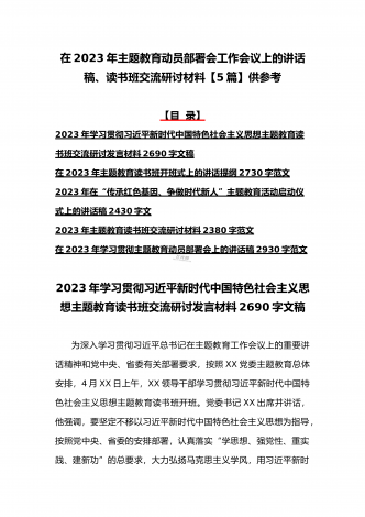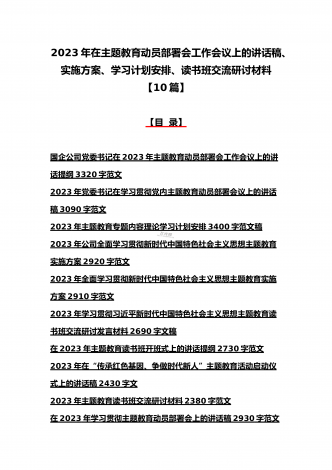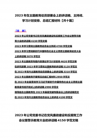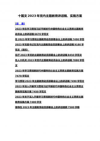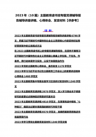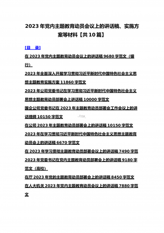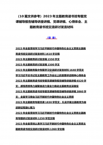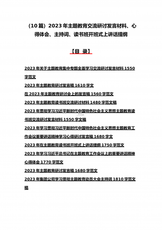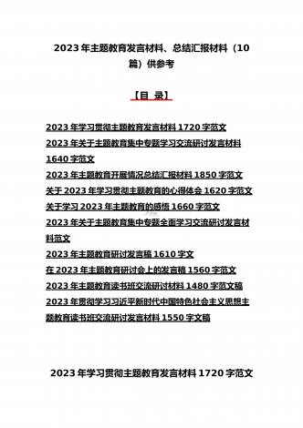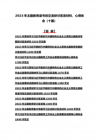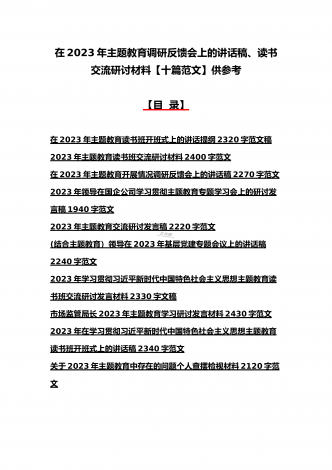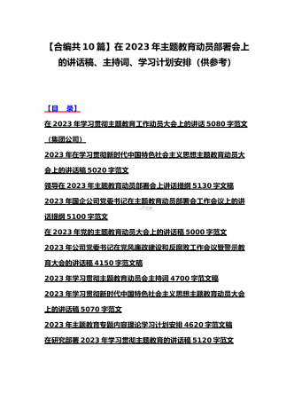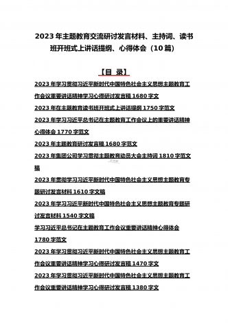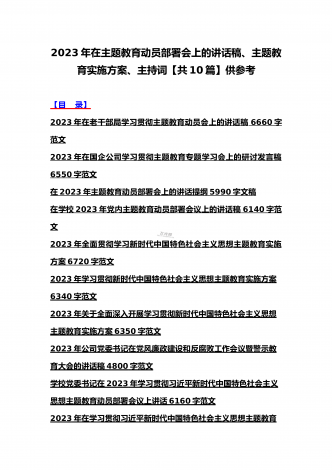 2023年党内主题教育筹备会、学习交流研讨交流发言稿、心得体会、基层党建专题会议、推进会议学习交流研讨交流发言稿(10篇)供参考【目录】书记在2023年党内主题教育筹备会上的讲话稿2100字范文2023年市委书记在中心组专题学习党的主题教育工作会议精神时的交流发言稿1800字范文关于学习2023年党内主题教育交流发言材料1590字范文2023年全面学习习近平总书记在主题教育工作会议上的重要讲话精神心得体会2190字范文2023年在贯彻学习习近平新时代中国特色社会主义思想主题教育读书班开班式上的讲...