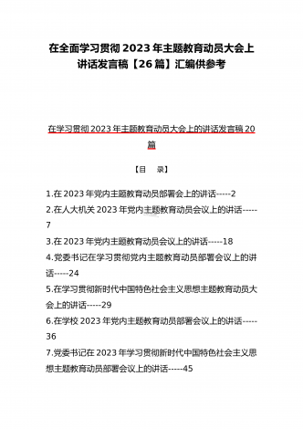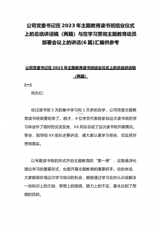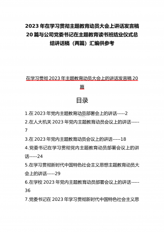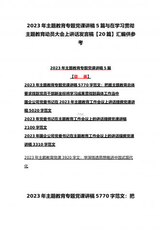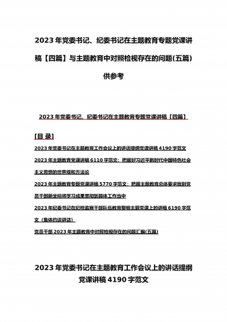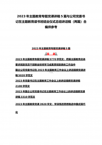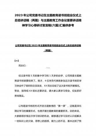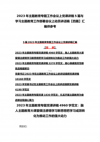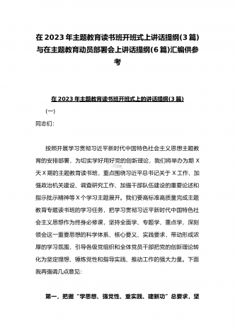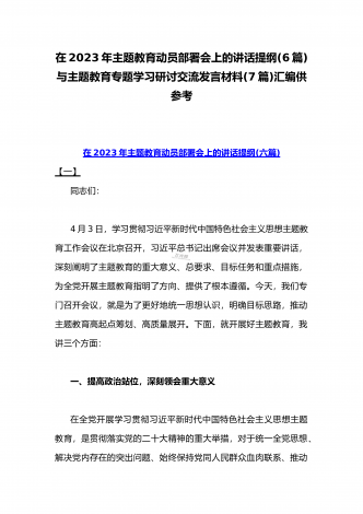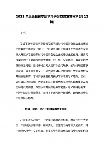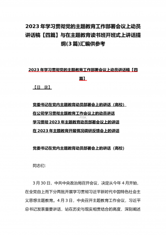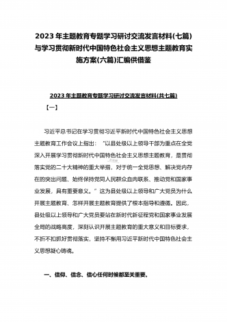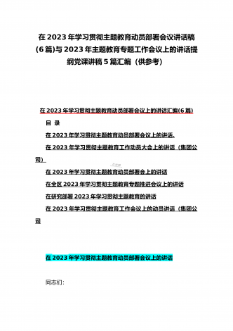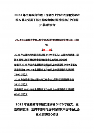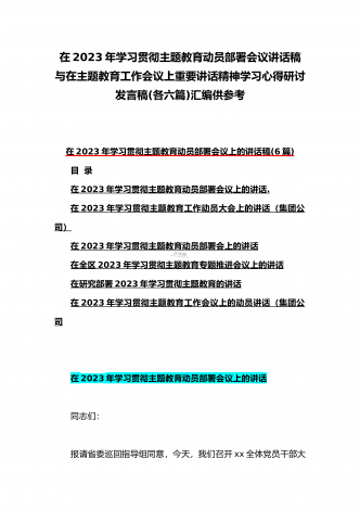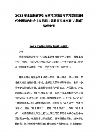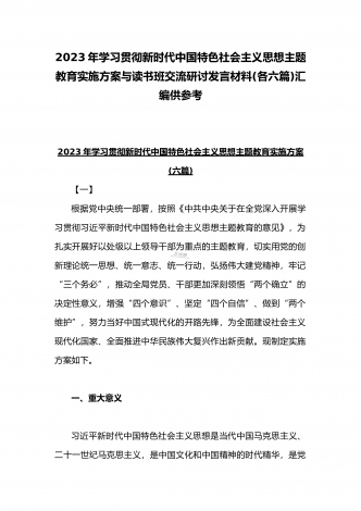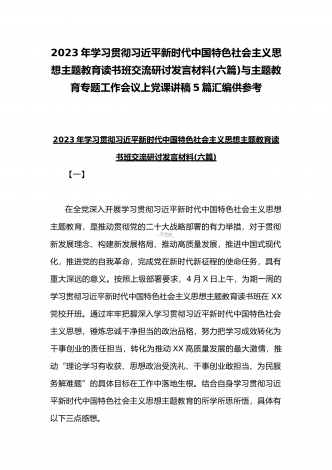 2023年学习贯彻习近平新时代中国特色社会主义思想主题教育读书班交流研讨发言材料(六篇)与主题教育专题工作会议上党课讲稿5篇汇编供参考2023年学习贯彻习近平新时代中国特色社会主义思想主题教育读书班交流研讨发言材料(六篇)【一】在全党深入开展学习贯彻习近平新时代中国特色社会主义思想主题教育,是推动贯彻党的二十大战略部署的有力举措,对于贯彻新发展理念、构建新发展格局、推动高质量发展,推进中国式现代化,推进党的自我革命,完成党在新时代新征程的使命任务,具有重大深远的意义。按照上级部署要求,4月X日上...