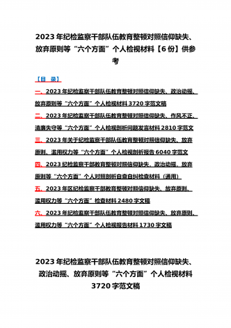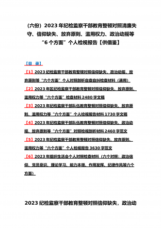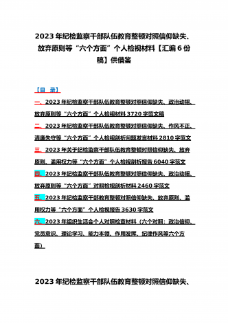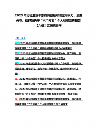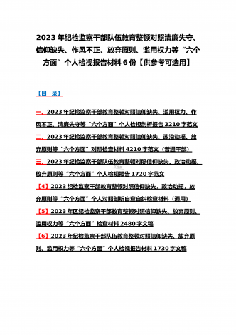 2023年纪检监察干部队伍教育整顿对照清廉失守、信仰缺失、作风不正、放弃原则、滥用权力等“六个方面”个人检视报告材料6份【供参考可选用】【目录】一、2023年纪检监察干部教育整顿对照信仰缺失、滥用权力、作风不正、清廉失守等“六个方面”个人检视剖析报告3210字范文二、2023年纪检监察干部教育整顿对照信仰缺失、政治动摇、放弃原则等“六个方面”对照检查材料4210字范文(普通干部)三、2023年纪检监察干部队伍教育整顿对照信仰缺失、政治动摇、放弃原则等“六个方面”个人检视报告1720字范文【4】2...