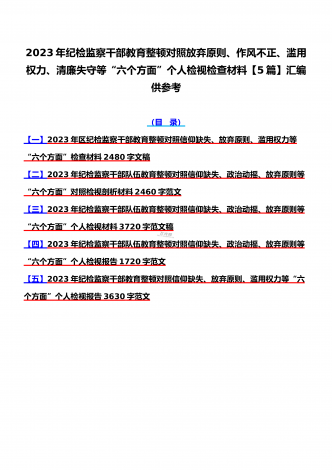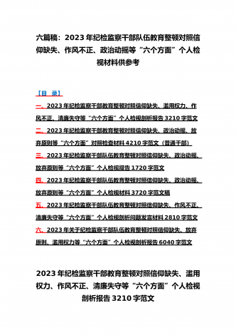 2023年纪检监察干部队伍教育整顿对照清廉失守、信仰缺失、作风不正、放弃原则、滥用权力等“六个方面”个人检视报告材料6份【供参考可选用】