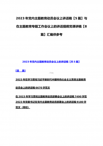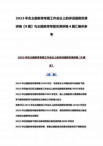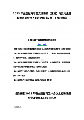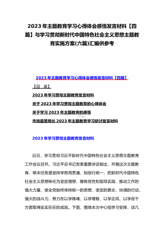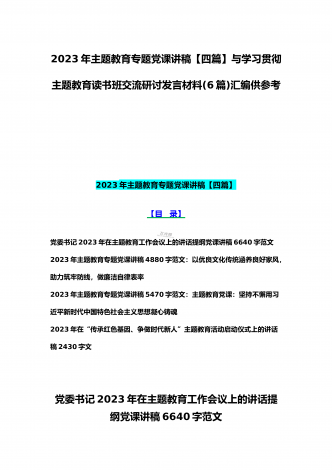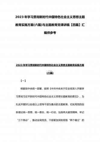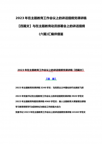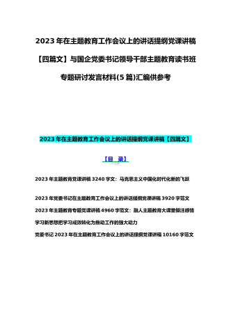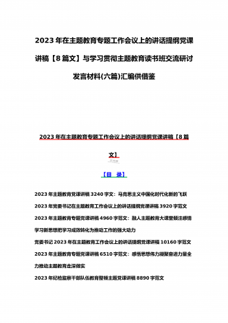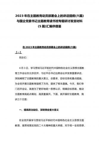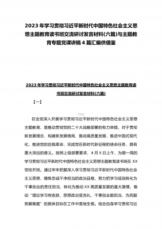 2023年学习贯彻习近平新时代中国特色社会主义思想主题教育读书班交流研讨发言材料(六篇)与在主题教育工作会议上讲话提纲党课讲稿【四篇文】汇编供参考2023年学习贯彻习近平新时代中国特色社会主义思想主题教育读书班交流研讨发言材料(六篇)【一】在全党深入开展学习贯彻习近平新时代中国特色社会主义思想主题教育,是推动贯彻党的二十大战略部署的有力举措,对于贯彻新发展理念、构建新发展格局、推动高质量发展,推进中国式现代化,推进党的自我革命,完成党在新时代新征程的使命任务,具有重大深远的意义。按照上级部署要求...