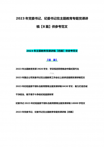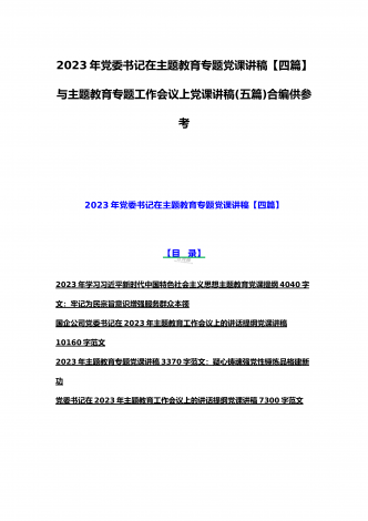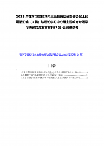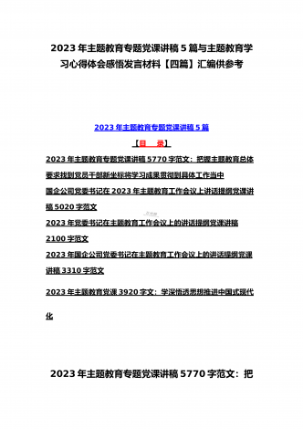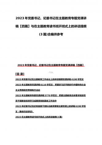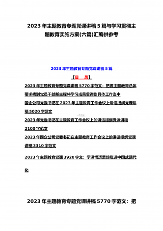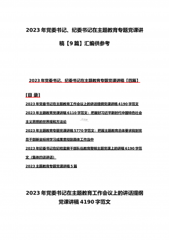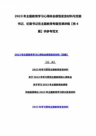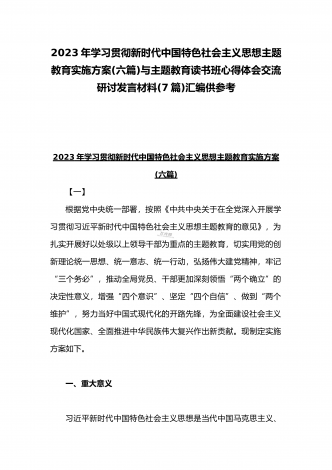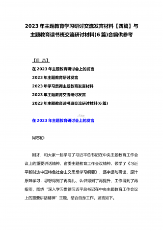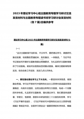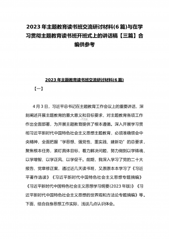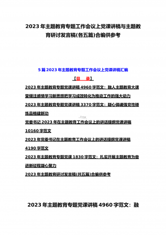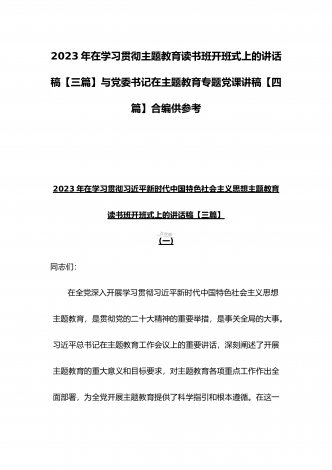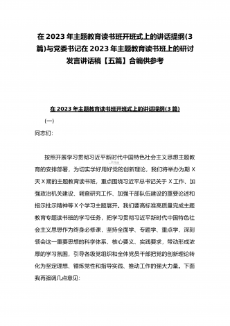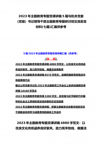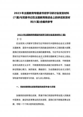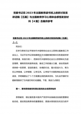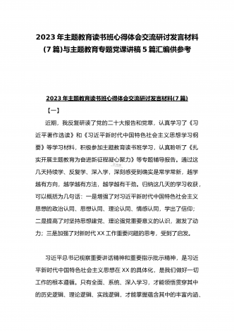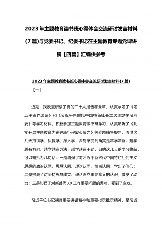 机关党委(党组)书记2023年主题教育专题研讨班交流发言材料(七篇)与党委书记在2023年主题教育读书班上研讨发言讲话稿【五篇】汇编供参考机关党委(党组)书记领导干部2023年主题教育专题研讨班交流发言材料(七篇)汇编(一)同志们:党的理论创新每前进一步,理论武装就要跟进一步。习近平总书记在学习贯彻习近平新时代中国特色社会主义思想主题教育工作会议上强调:“开展这次主题教育,根本任务是坚持学思用贯通、知信行统一,把新时代中国特色社会主义思想转化为坚定理想、锤炼党性和指导实践、推动工作的强大力量,使...