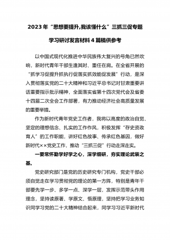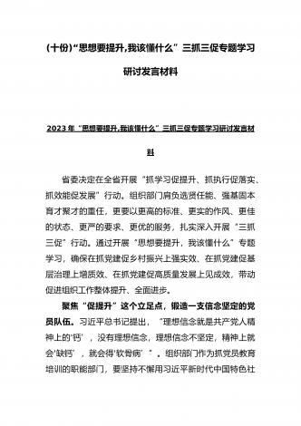 2023年“思想要提升,我该懂什么”三抓三促专题学习研讨发言材料(四份)与深入开展“三抓三促”行动情况总结典型经验材料(六篇)汇编供借鉴“思想要提升,我该懂什么”三抓三促专题学习研讨发言材料(四份)供参考习近平总书记曾强调:“重视学习,善于学习,是中国共产党独特的精神气质。”学习是文明传承之途、人生成长之梯、政党巩固之基、国家兴盛之要。对于我们每个人来说,都要在学习上下一番真功夫、实功夫、苦功夫。“学然后知不足”。全面学习,才能知道自己哪里需要提升,现结合“三抓三促”活动,谈一谈思想要提升,我该...