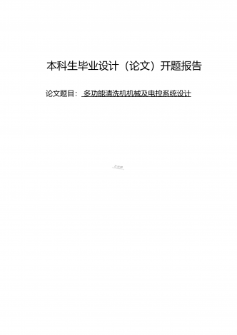 本科生毕业设计(论文)开题报告论文题目:多功能清洗机机械及电控系统设计一、课题选题的目的、意义(一)课题选题的目的随着工业和制造业的飞速发展,工厂每天都有各种零件废弃,造成工业浪费。为了减缓浪费,更加符合绿色发展的主题,减少零部件的废弃率刻不容缓。而制造零部件作为一个机械结构的基础,因而零部件平时的检修和养护是重中之重。清洗零部件则是关键的一环,而采用何种方式清洗,如何更高效地清洗,以减少工人工序,是本课题研究的主要方向。现基于小型零件的五种清洗方式:擦洗、煮洗、喷洗、振动清洗、超声波清洗。设计...