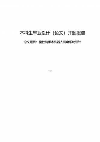 本科生毕业设计(论文)开题报告论文题目:腹腔镜手术机器人机电系统设计一、课题选题的目的和意义(一)课题选题的目的从18世纪开始,医学界出现了开放式手术,从此世界医学出现了质的进步。开放式手术能让术者直观地开展手术,但比较考验术者的技术,并且由于伤口较大,需要较长时间的术后恢复,疤痕较大(见图1)。图1手术对比图上世纪80年代开始出现了腹腔镜手术。腹腔镜微创手术一般需要3到5个皮肤切口用于插入手术器械、腹腔镜等,故被称为“多孔腹腔镜”[1,2]。相比开放式手术,多孔腹腔镜手术减轻了病人的术后痛苦、...