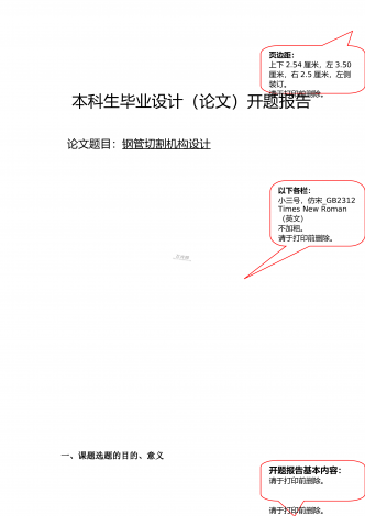 本科生毕业设计(论文)开题报告论文题目:钢管切割机构设计一、课题选题的目的、意义页边距:上下2.54厘米,左3.50厘米,右2.5厘米,左侧装订。请于打印前删除。开题报告基本内容:请于打印前删除。请于打印前删除。以下各栏:小三号,仿宋_GB2312TimesNewRoman(英文)不加粗。请于打印前删除。(一)课题选题的目的钢管,具有空心截面,其长度远大于直径或周长的钢材。其材质有碳素结构钢、低合金结构钢、合金钢和复合钢等。按生产工艺可分为无缝钢管和焊接钢管。钢管不仅用于输送流体和粉状固体、交换...