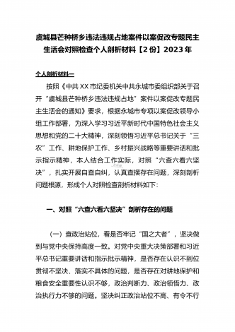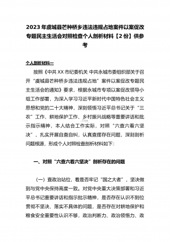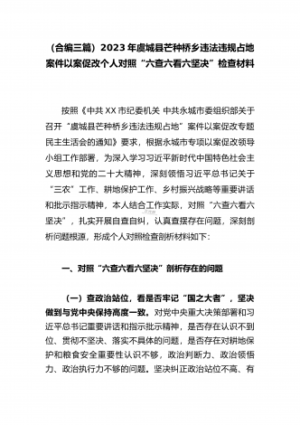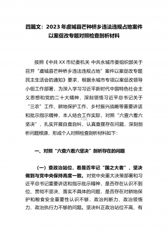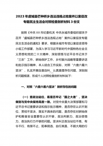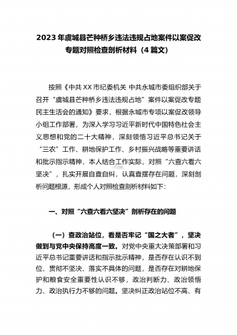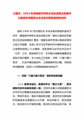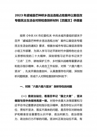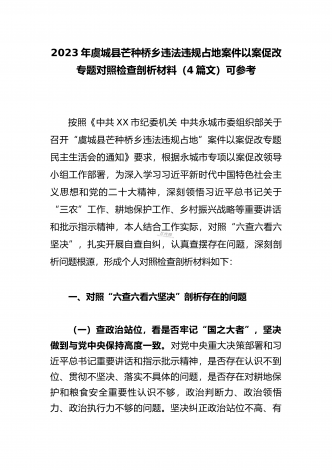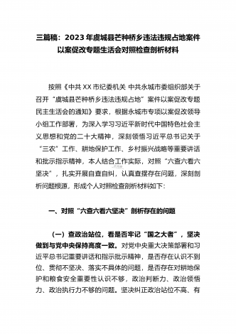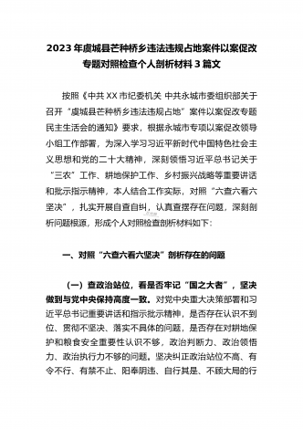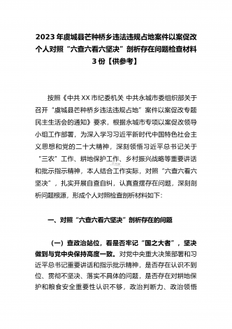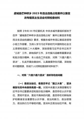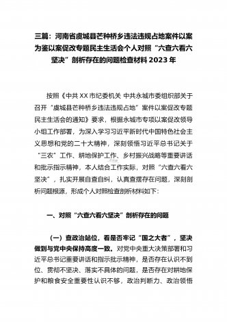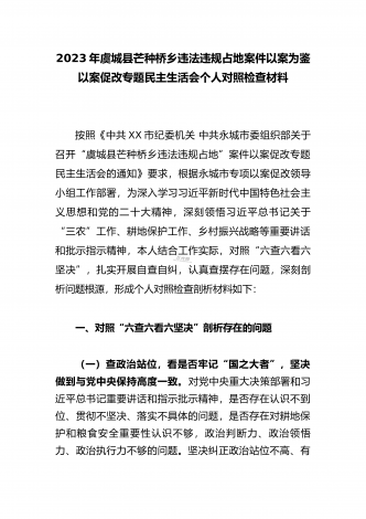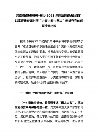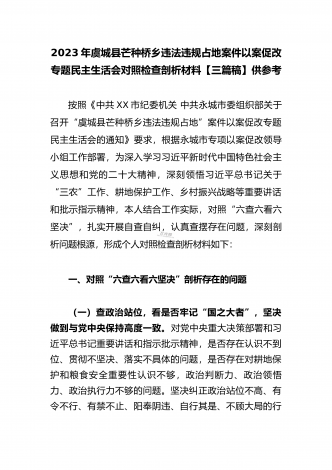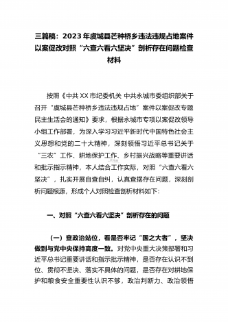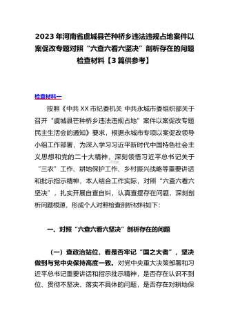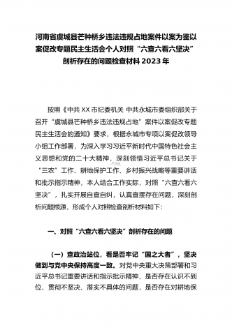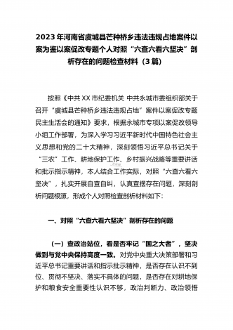 2023年河南省虞城县芒种桥乡违法违规占地案件以案为鉴以案促改对照“六查六看六坚决”剖析存在的问题检查材料(3篇)