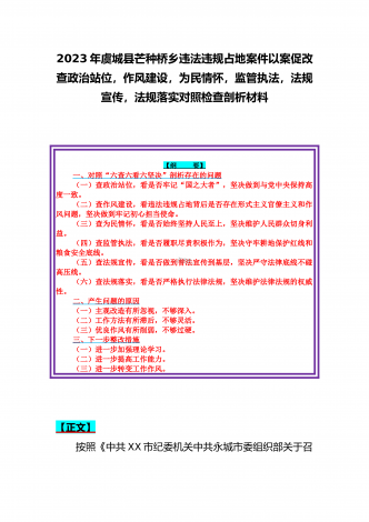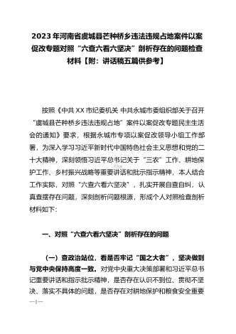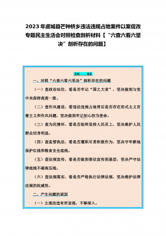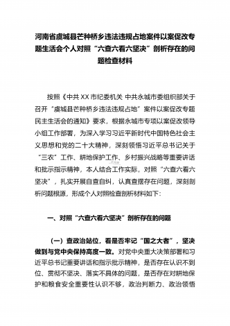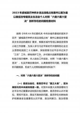 2023年虞城县芒种桥乡违法违规占地案件以案促改查政治站位,作风建设,为民情怀,监管执法,法规宣传,法规落实“六查六看六坚决”剖析存在的问题对照检查剖析材料