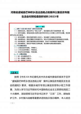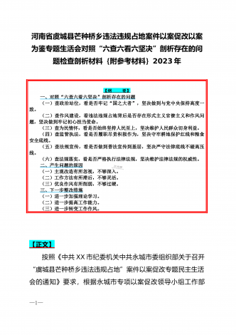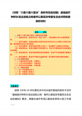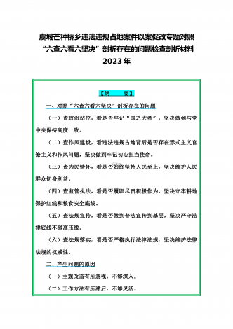 2023年虞城县芒种桥乡违法违规占地案件以案促改查政治站位,作风建设,为民情怀,监管执法,法规宣传,法规落实“六查六看六坚决”剖析存在的问题对照检查剖析材料【纲要】一、对照“六查六看六坚决”剖析存在的问题(一)查政治站位,看是否牢记“国之大者”,坚决做到与党中央保持高度一致。(二)查作风建设,看违法违规占地背后是否存在形式主义官僚主义和作风问题,坚决做到牢记初心担当使命。(三)查为民情怀,看是否始终坚持人民至上,坚决维护人民群众切身利益。(四)查监管执法,看是否履职尽责积极作为,坚决守牢耕地保护...