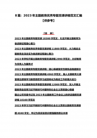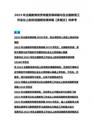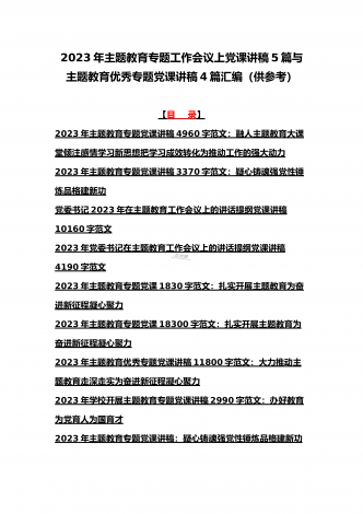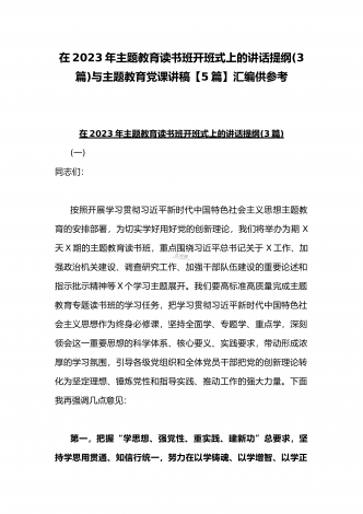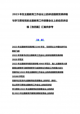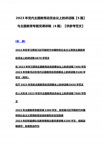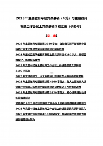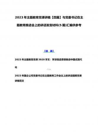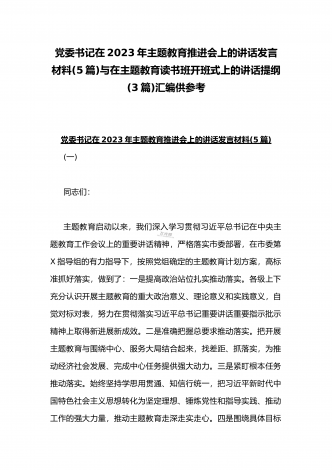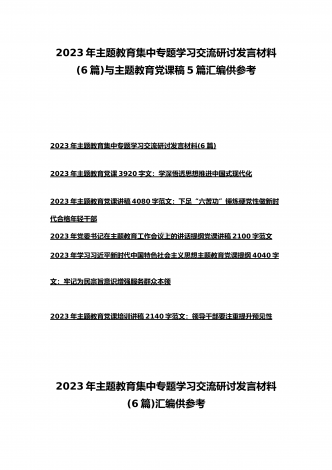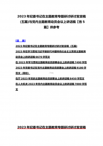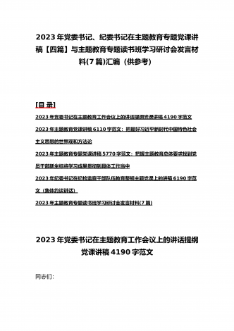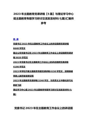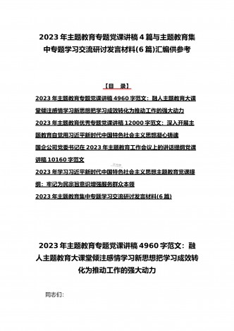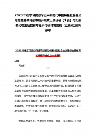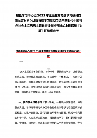 理论学习中心组2023年主题教育专题学习研讨交流发言材料(七篇)与在学习贯彻习近平新时代中国特色社会主义思想主题教育读书班开班式上讲话稿【3篇】汇编供参考理论学习中心组2023年主题教育专题学习研讨交流发言材料(七篇)(一)“这次主题教育不划阶段、不分环节,要把理论学习、调查研究、推动发展、检视整改贯通起来,有机融合、一体推进。”习近平总书记就如何开展好主题教育提出明确要求,为扎实抓好主题教育提供了行动指南。就如何全面落实四项重点措施,确保主题教育取得实效,结合自身工作实际,浅谈几点认识体会。一...