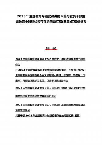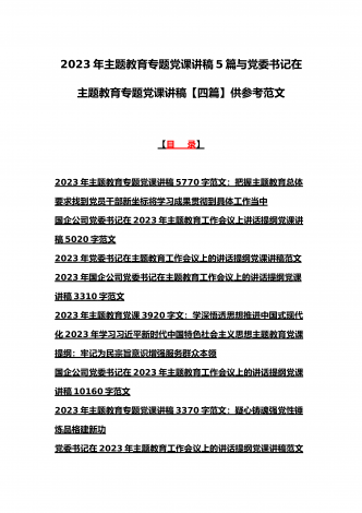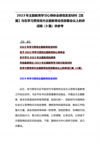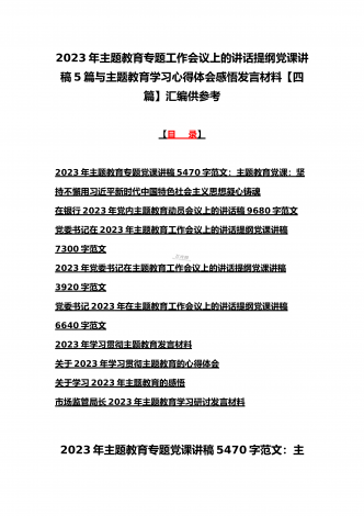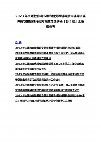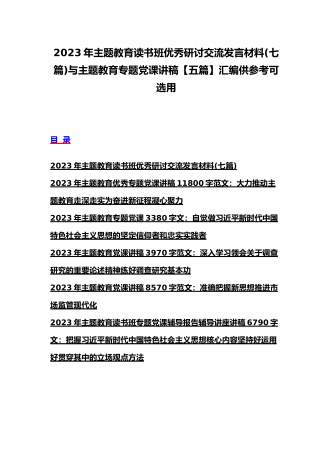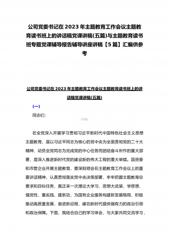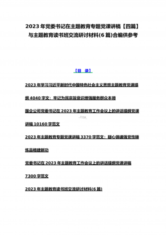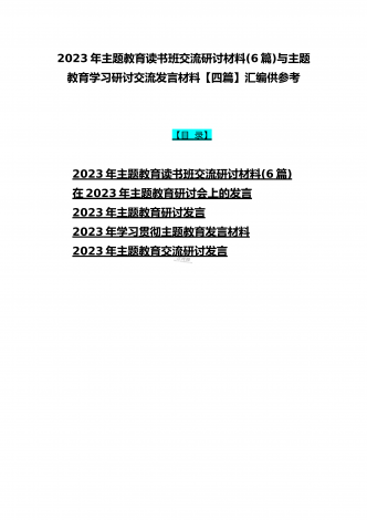 2023年学习贯彻习近平新时代中国特色社会主义思想主题教育读书班交流研讨发言材料(六篇)与学校党委书记在主题教育工作会议集中学习会上的讲话发言材料(四篇)汇编供参考2023年学习贯彻习近平新时代中国特色社会主义思想主题教育读书班交流研讨发言材料(六篇)【一】在全党深入开展学习贯彻习近平新时代中国特色社会主义思想主题教育,是推动贯彻党的二十大战略部署的有力举措,对于贯彻新发展理念、构建新发展格局、推动高质量发展,推进中国式现代化,推进党的自我革命,完成党在新时代新征程的使命任务,具有重大深远的意义...