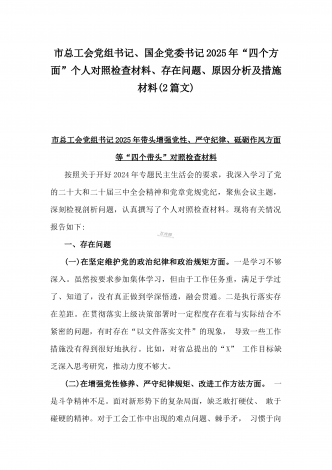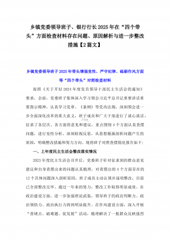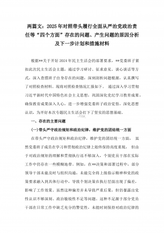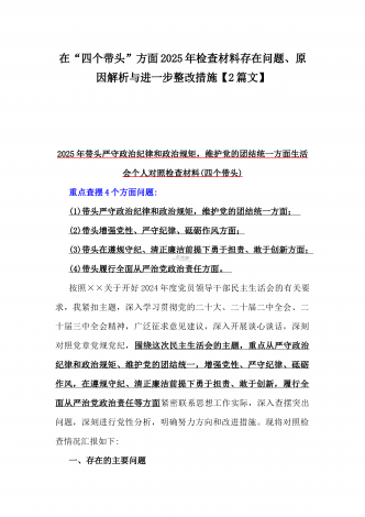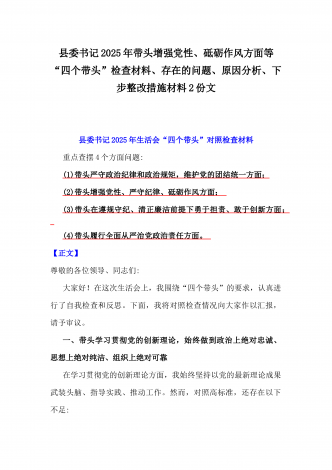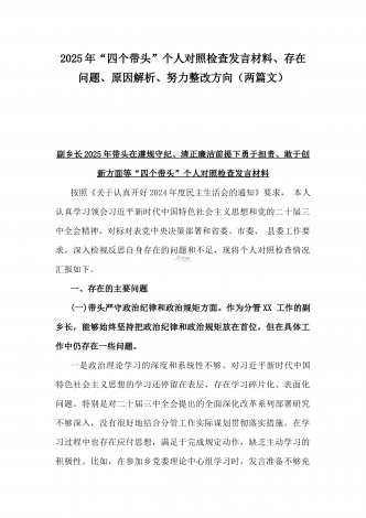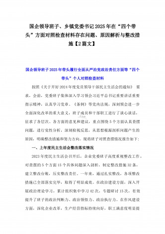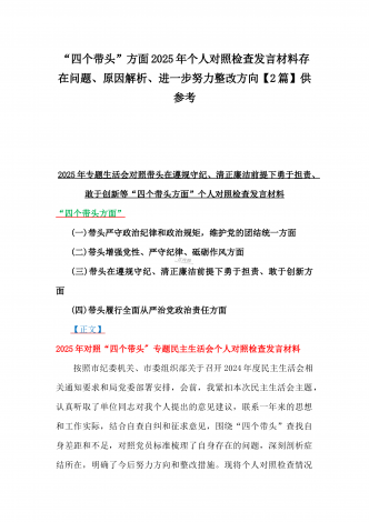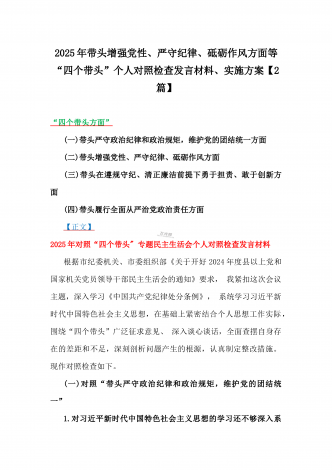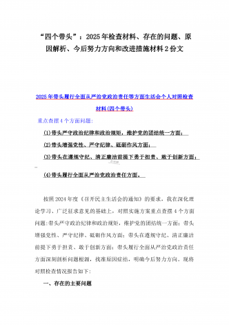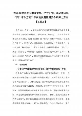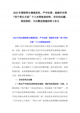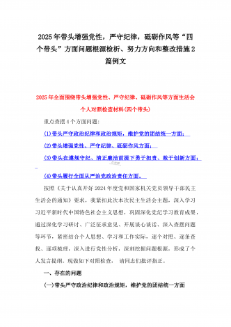 2025年围绕带头增强党性、严守纪律、砥砺作风等“四个带头方面”个人对照检查材料、存在的问题、原因剖析、今后整改措施材料2份文
