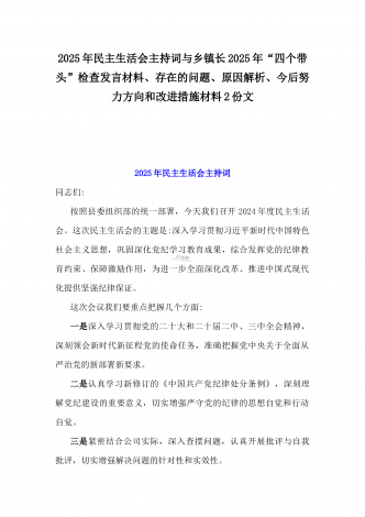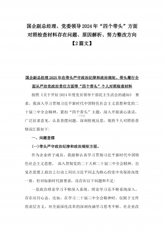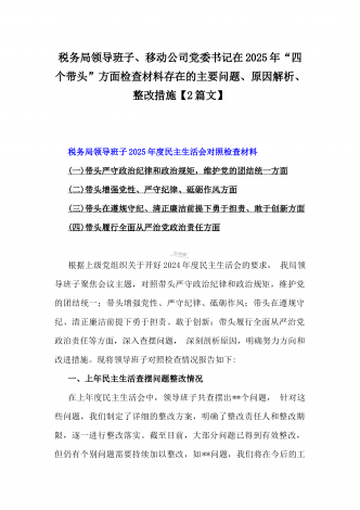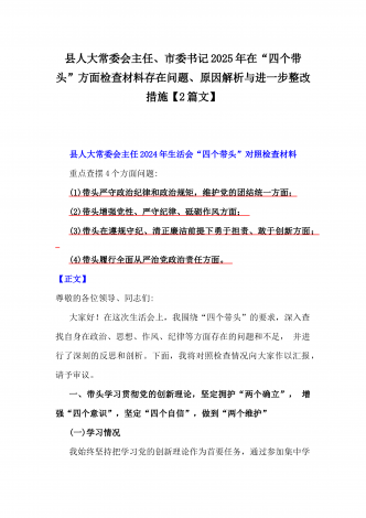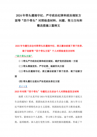 2025年围绕带头增强党性、严守纪律、砥砺作风等“四个带头方面”个人对照检查材料、存在的问题、原因剖析、今后整改措施材料2份文2025年局长围绕带头增强党性、严守纪律、砥砺作风等“四个带头方面”个人对照检查材料按照《关于开好2024年度党员领导干部民主生活会的通知》要求,会前,我深入学习领会习近平总书记重要讲话重要指示精神,认真学习党章、《中国共产党纪律处分条例》等党内法规,深刻领会进一步全面深化改革的重大意义,与班子成员和广大干部进行了谈心谈话,征求了各层次、各方面的意见和建议,联系本人思想和...
