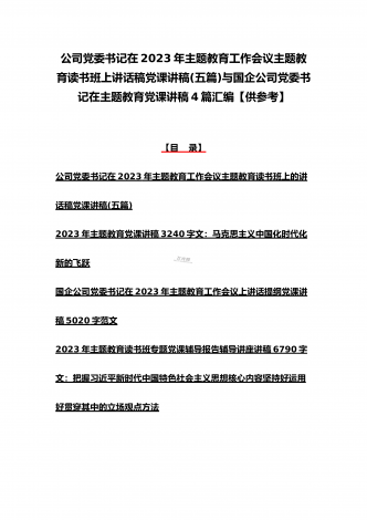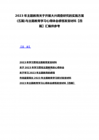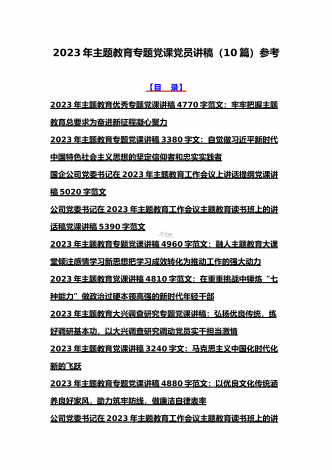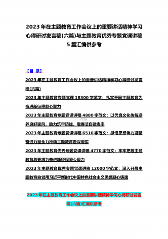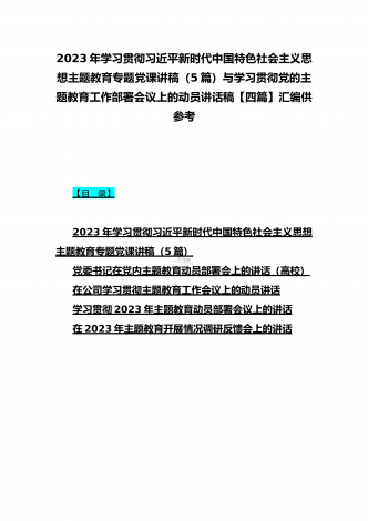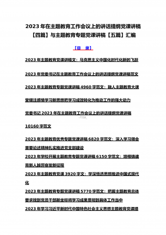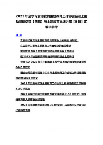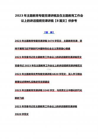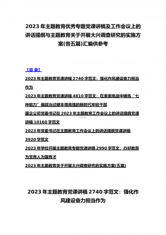 2023年主题教育大兴调查研究专题党课讲稿与工作会议上的讲话提纲党课讲稿【6篇】与理论学习中心组主题教育专题学习研讨交流发言材料(7篇)汇编供参考【目录】2023年主题教育大兴调查研究专题党课讲稿:调查研究要注意几个关键点2023年学校开展主题教育专题党课讲稿2990字范文:办好教育为党育人为国育才在2023主题教育读书班上的专题党课辅导报告:在坚持不懈用习近平新时代中国特色社会主义思想凝心铸魂上学在前、干在先、作表率,用行动体现学习实效,以实干体现担当作为2023年主题教育党课培训讲稿:领导干...