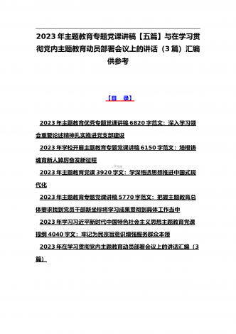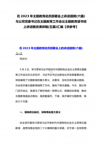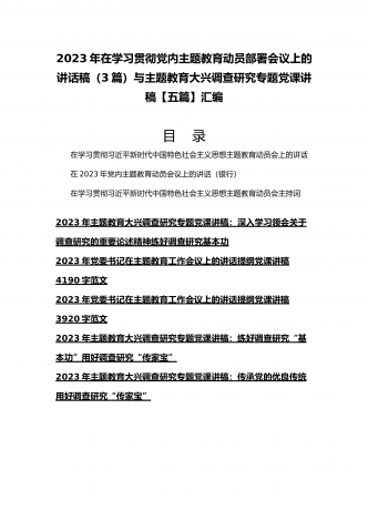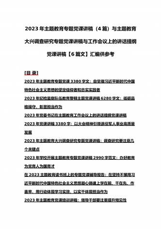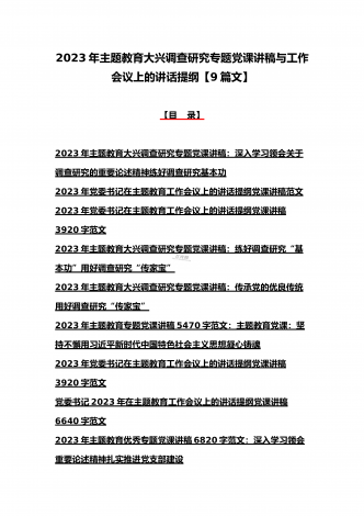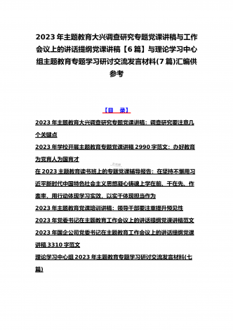 2023年主题教育大兴调查研究专题党课讲稿与工作会议上的讲话提纲党课讲稿【6篇】与理论学习中心组主题教育专题学习研讨交流发言材料(7篇)汇编供参考