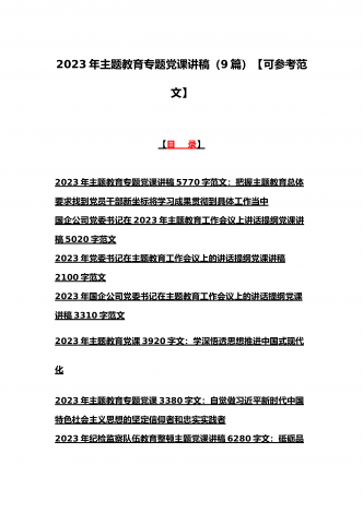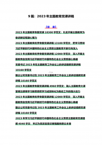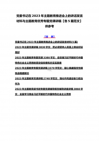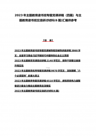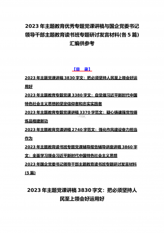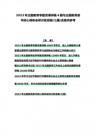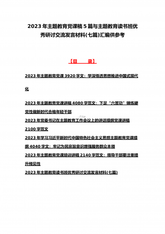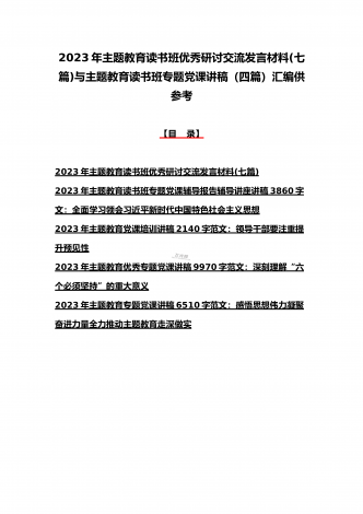 2023年学习贯彻习近平新时代中国特色社会主义思想主题教育读书班交流研讨发言材料(六篇)与党委书记在主题教育读书班上的研讨发言讲话稿【五篇】汇编供参考2023年学习贯彻习近平新时代中国特色社会主义思想主题教育读书班交流研讨发言材料(六篇)【一】在全党深入开展学习贯彻习近平新时代中国特色社会主义思想主题教育,是推动贯彻党的二十大战略部署的有力举措,对于贯彻新发展理念、构建新发展格局、推动高质量发展,推进中国式现代化,推进党的自我革命,完成党在新时代新征程的使命任务,具有重大深远的意义。按照上级部署...
