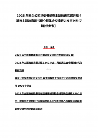 2023年主题教育大兴调查研究专题党课讲稿与工作会议主题教育读书班上的讲话稿党课讲稿【五篇】与在主题教育专题工作会议上的讲话提纲党课讲稿【8篇】供参考可编辑【目录】2023年主题教育大兴调查研究专题党课讲稿:用好党的传家宝大兴调查研究之风党委书记在2023年主题教育工作会议上的讲话提纲党课讲稿7300字范文公司党委书记在2023年主题教育工作会议主题教育读书班上的讲话稿党课讲稿8100字范文2023年主题教育专题党课讲稿:把握主题教育总体要求找到党员干部新坐标将学习成果贯彻到具体工作当中党委书记...