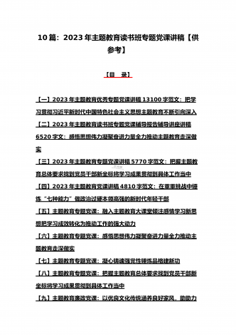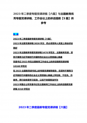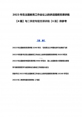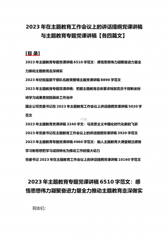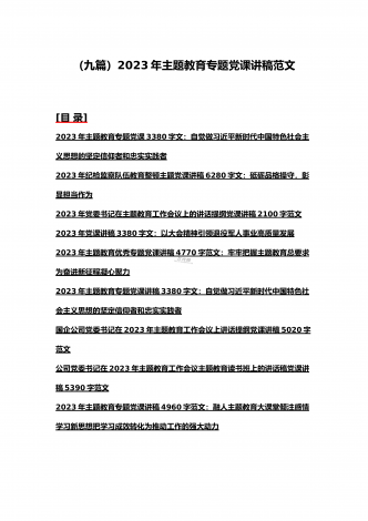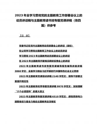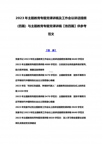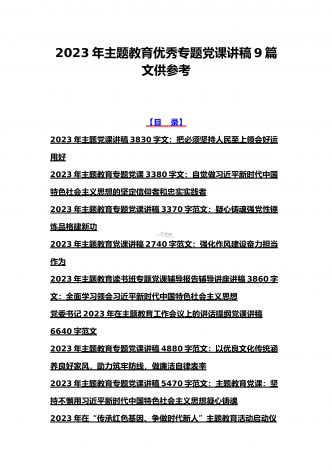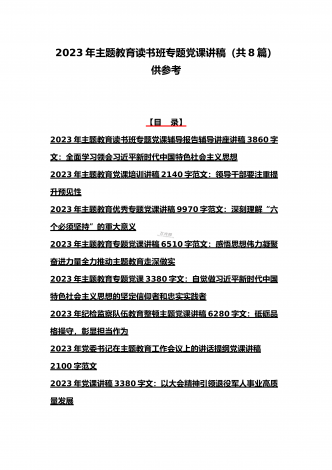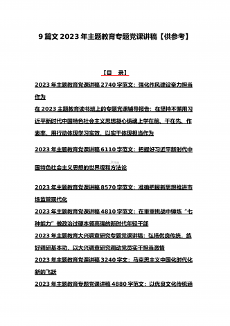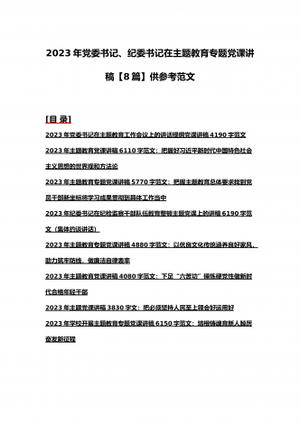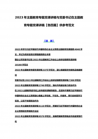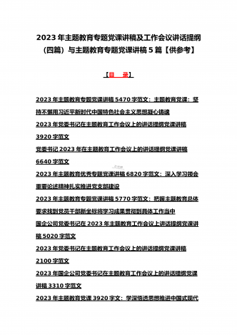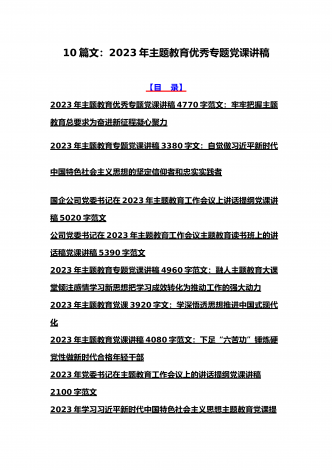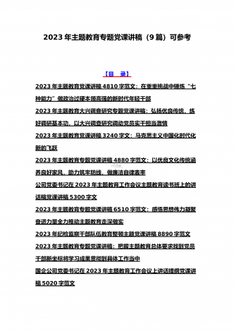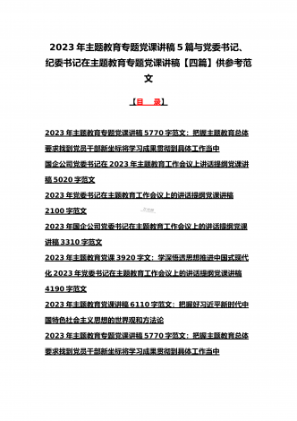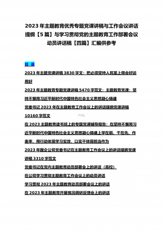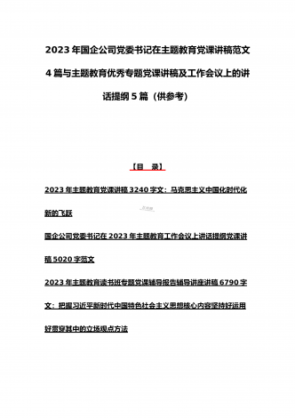 2023年主题教育专题党课讲稿、大兴调查研究专题党课讲稿与学习贯彻习近平新时代中国特色社会主义思想主题教育专题党课讲稿(各5篇)【目录】2023年主题教育专题党课讲稿5470字范文:主题教育党课:坚持不懈用习近平新时代中国特色社会主义思想凝心铸魂2023年公司党委书记在主题教育工作会议主题教育读书班上的讲话稿党课讲稿4390字文2023年主题教育党课讲稿4080字范文:下足“六苦功”锤炼硬党性做新时代合格年轻干部2023年主题教育党课讲稿3970字范文:深入学习领会关于调查研究的重要论述精神练好...