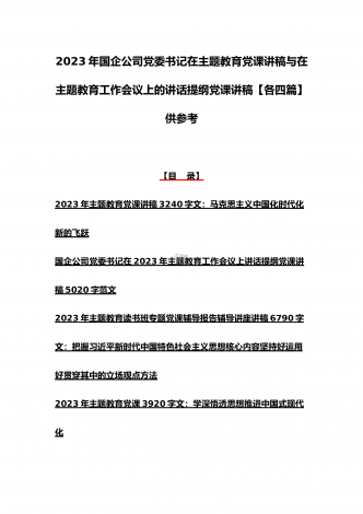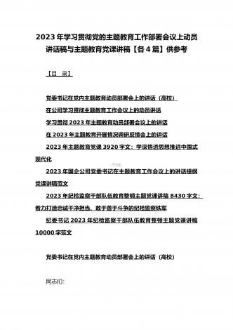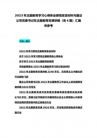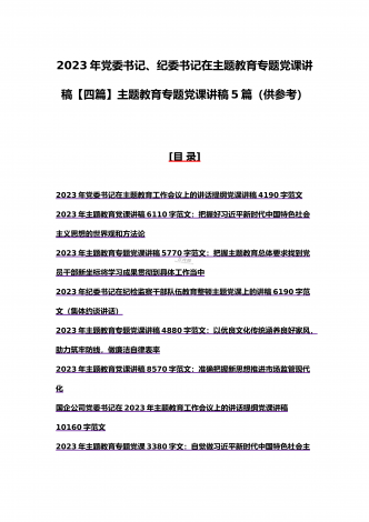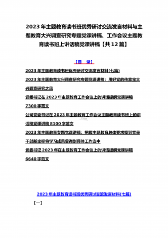 2023年主题教育大兴调查研究专题党课讲稿、工作会议主题教育读书班上的讲话稿党课讲稿、主题教育读书班专题党课辅导报告辅导讲座讲稿(10篇)汇编供参考【目录】2023年主题教育大兴调查研究专题党课讲稿:用好党的传家宝大兴调查研究之风党委书记在2023年主题教育工作会议上的讲话提纲党课讲稿7300字范文公司党委书记在2023年主题教育工作会议主题教育读书班上的讲话稿党课讲稿8100字范文2023年主题教育专题党课讲稿:把握主题教育总体要求找到党员干部新坐标将学习成果贯彻到具体工作当中党委书记2023...