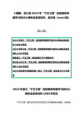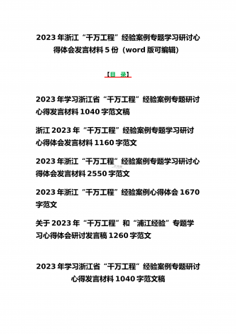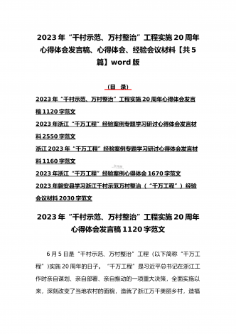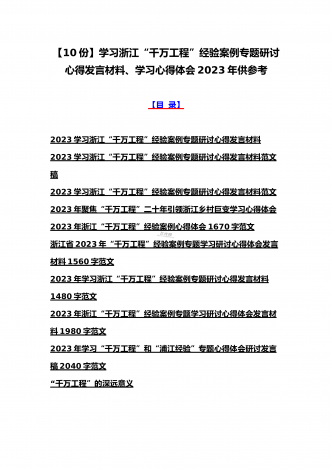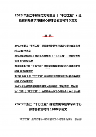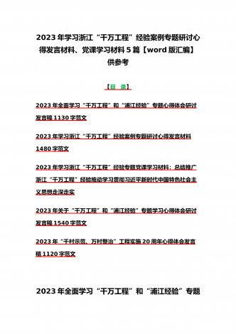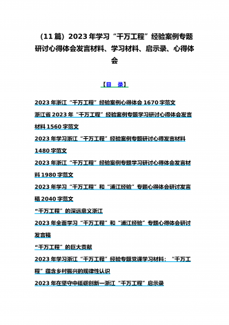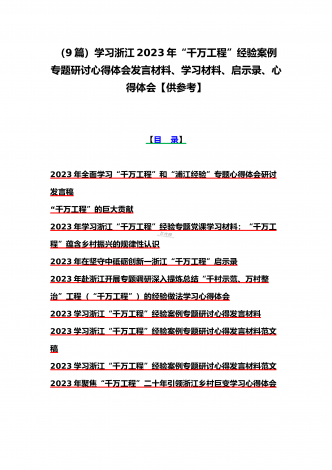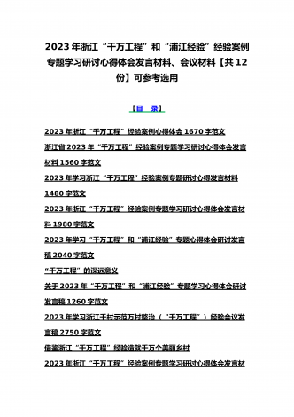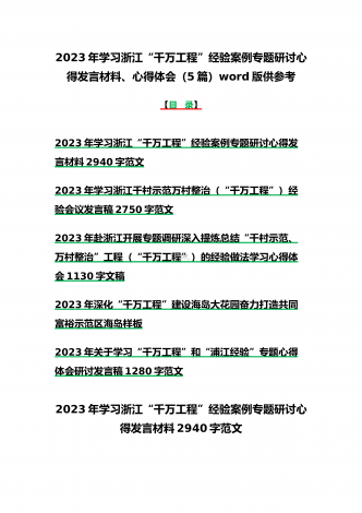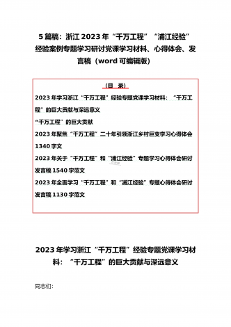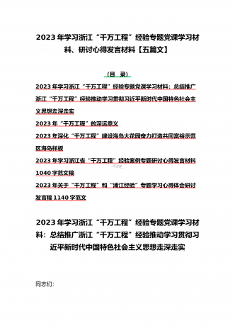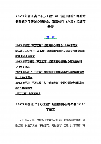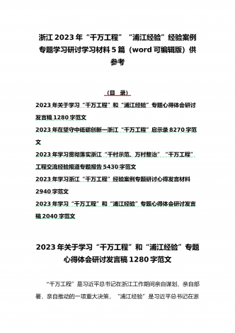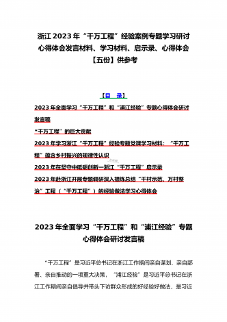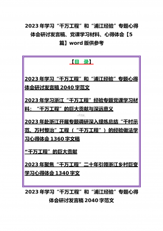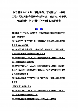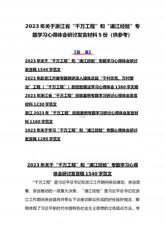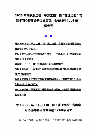 2023年学习“千村示范、万村整治”(千万工程)和“浦江经验”专题心得体会研讨专题报告、发言稿、党课学习材料、经验会议材料【5篇】word版供参考【目录】2023年学习贯彻落实浙江“千村示范、万村整治”“千万工程”工程交流经验报道专题报告5430字范文2023年学习浙江“千万工程”经验专题党课学习材料:“千万工程”蕴含乡村振兴的规律性认识“千万工程”的深远意义2023年关于“千万工程”和“浦江经验”专题学习心得体会研讨发言稿1140字范文2023年磐安县学习浙江千村示范万村整治(“千万工程”)经...
