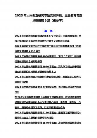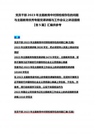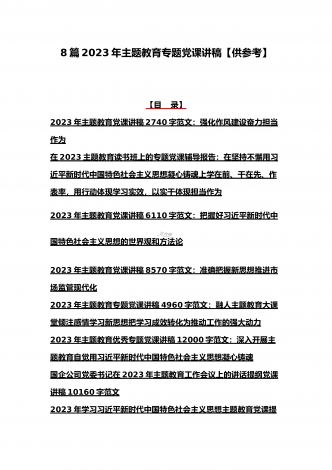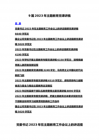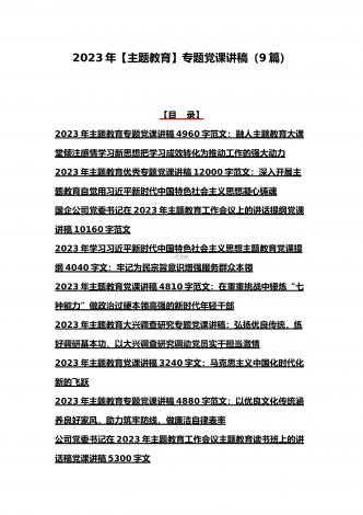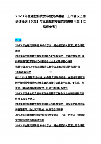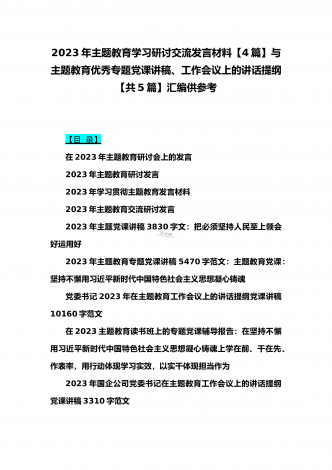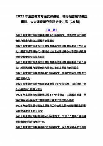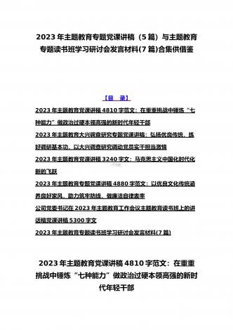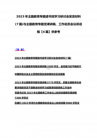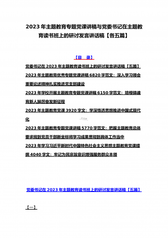 机关党委(党组)书记领导干部2023年主题教育专题研讨班交流发言材料(七篇)与主题教育专题党课讲稿、辅导报告辅导讲座讲稿【五篇】供参考【目录】机关党委(党组)书记领导干部2023年主题教育专题研讨班交流发言材料(七篇)2023年主题教育专题党课讲稿6510字范文:感悟思想伟力凝聚奋进力量全力推动主题教育走深做实2023年主题教育读书班专题党课辅导报告辅导讲座讲稿6790字文:把握习近平新时代中国特色社会主义思想核心内容坚持好运用好贯穿其中的立场观点方法2023年主题教育读书班专题党课辅导报告辅导...