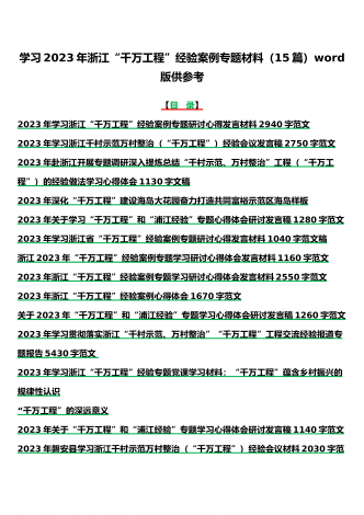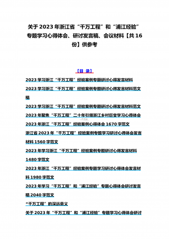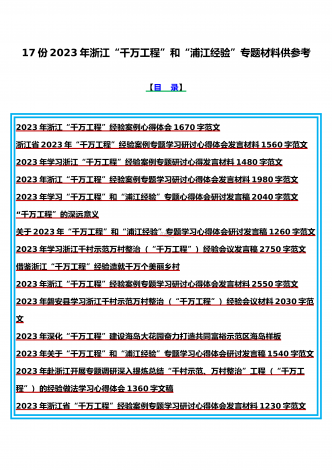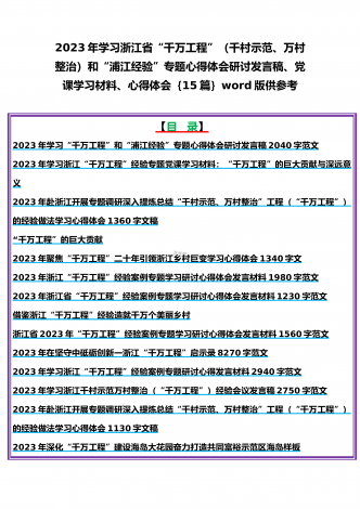 15篇:学习2023年浙江“千村示范、万村整治”(千万工程)和“浦江经验”专题心得体会研讨专题报告、发言稿、党课学习材料、经验会议材料word版供参考【目录】2023年学习贯彻落实浙江“千村示范、万村整治”“千万工程”工程交流经验报道专题报告5430字范文2023年学习浙江“千万工程”经验专题党课学习材料:“千万工程”蕴含乡村振兴的规律性认识“千万工程”的深远意义2023年关于“千万工程”和“浦江经验”专题学习心得体会研讨发言稿1140字范文2023年磐安县学习浙江千村示范万村整治(“千万工程”...