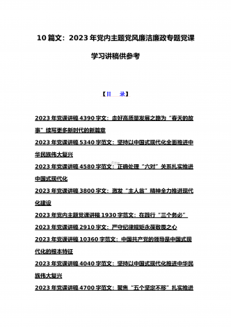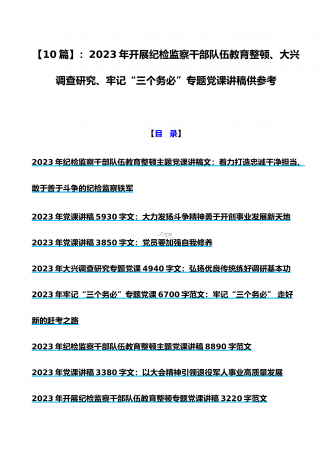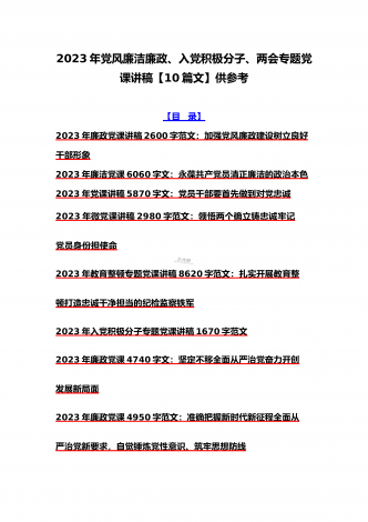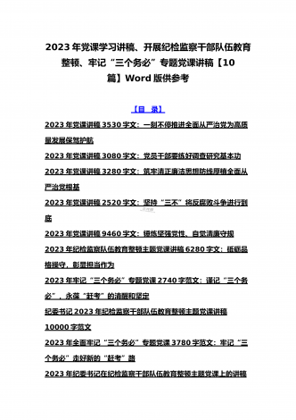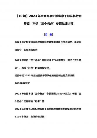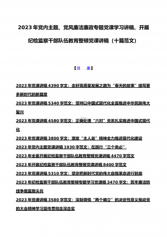 2023年学校专题辅导、全国“两会”精神、学校二十大专题党课讲稿、纪检监察干部队伍教育整顿专题党课学习讲稿(共10篇文)【目录】2023年学校专题辅导党课讲稿7340字文:学深、悟透、笃行,以新担当新作为办好人民满意的教育2023年全国“两会”精神专题学习党课讲稿2610字范文2023年党课讲稿8950字文:新时代新征程办好人民满意教育的根本遵循2023年学校二十大党课讲稿8960字文:新时代新征程办好人民满意教育的根本遵循学习贯彻2023年两会精神宣讲稿7400字范文:以经济建设为中心着力推动...