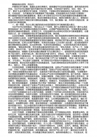 尊敬的各位领导,同志们: 开展党纪学习教育,是强化全党纪律意识、提高遵规守纪自觉性最直接、最有效的途径和“手段。习近平总书记强调组织开展好党纪学习教育,引导党员干部学纪、知纪、明纪、守”“纪,要求扎实开展党纪学习教育,引导党员、干部真正把纪律规矩转化为政治自觉、思想自”“”觉、行动自觉,为开展党纪学习教育提供了根本遵循。纪检监察机关作为党的纪律部队,肩负着维护党的纪律的重要职责,要深入学习贯彻习近平总书记相关重要讲话和重要指示精神,以开展党纪学习教育为契机,推动纪律教育走深走实,确保纪律教...