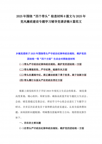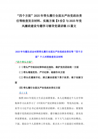 “四个方面”2025年带头履行全面从严治党政治责任等检查发言材料、实施方案【8份】与2025年党风廉政建设专题学习辅导党课讲稿15篇文
