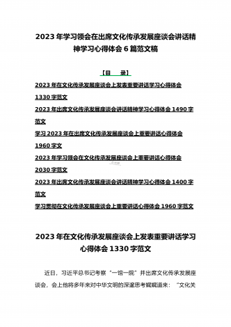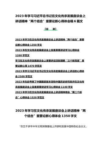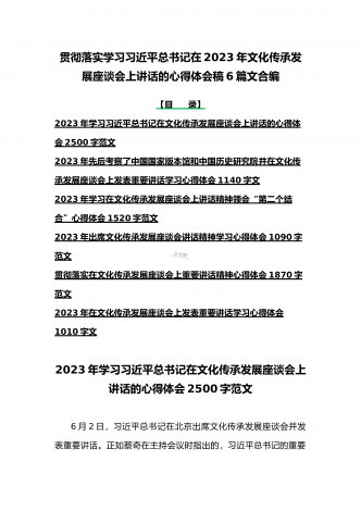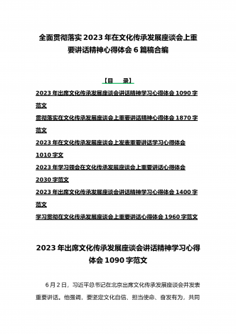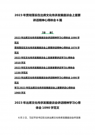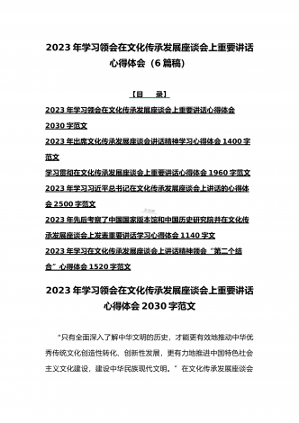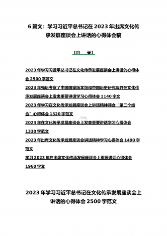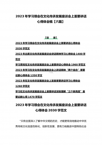 2023年学习贯彻落实在文化传承发展座谈会上讲话精神“两个结合”重要论断心得体会稿6篇文合编【供参考】【目录】2023年学习在文化传承发展座谈会上讲话精神“两个结合”重要论断心得体会1350字文2023年在文化传承发展座谈会上发表重要讲话学习心得体会1260字范文学习在文化传承发展座谈会上重要讲话深刻理解“三个新高度”重要论断心得1470字范文2023年出席文化传承发展座谈会讲话精神学习心得体会1090字范文贯彻落实在文化传承发展座谈会上重要讲话精神心得体会1870字范文2023年在文化传承发展...