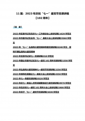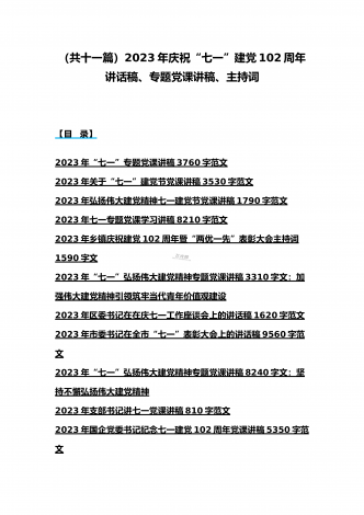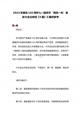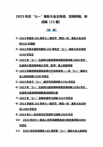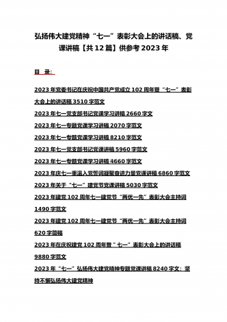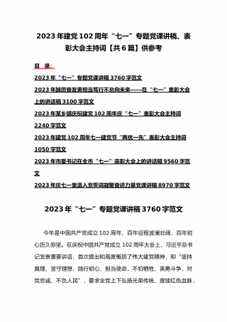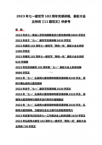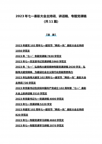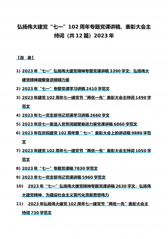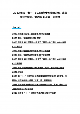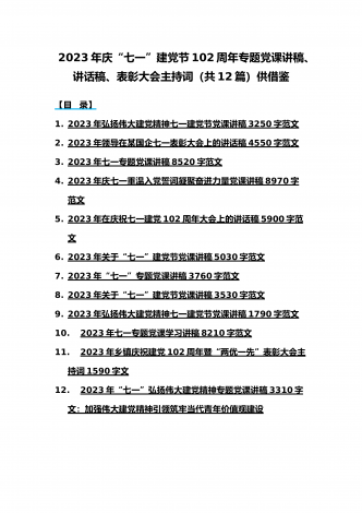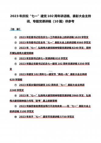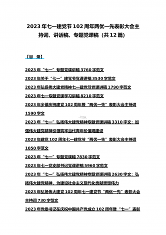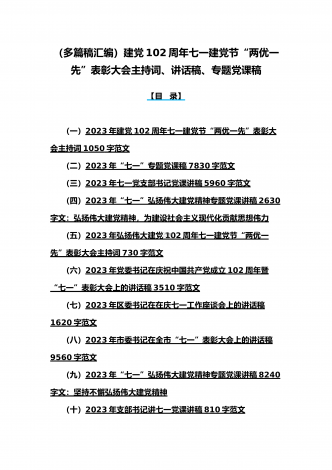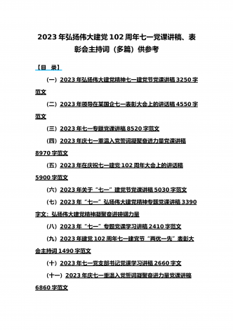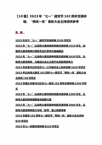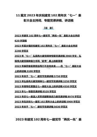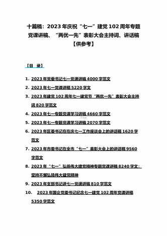 十篇稿:2023年庆祝“七一”建党102周年专题党课讲稿、“两优一先”表彰大会主持词、讲话稿【供参考】