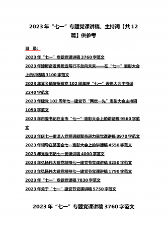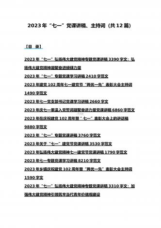 十篇稿:2023年庆祝“七一”建党102周年专题党课讲稿、“两优一先”表彰大会主持词、讲话稿【供参考】【目录】1.2023年党委书记七一党课讲稿4000字范文2.2023年七一党课讲稿5220字文3.2023年建党102周年七一建党节“两优一先”表彰大会主持词820字范文4.2023年七一专题党课学习讲稿4660字范文5.2023年七一专题党课学习讲稿2070字范文6.2023年区委书记在在庆七一工作座谈会上的讲话稿1620字范文7.2023年市委书记在全市“七一”表彰大会上的讲话稿9560字范...