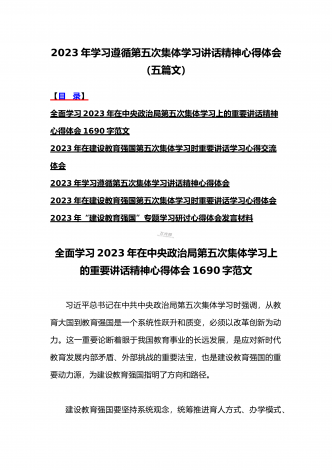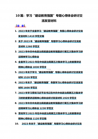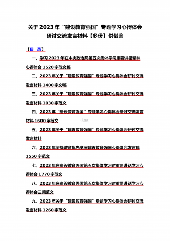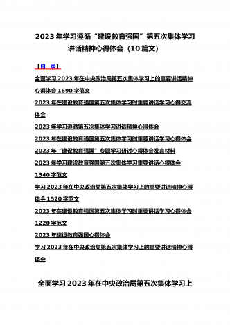 2023年关于“建设教育强国”专题学习心得体会研讨交流发言材料、习得体会【5篇】供参考【目录】2023年关于“建设教育强国”专题学习心得体会研讨交流发言材料1600字范文2023年学习贯彻习近平总书记在中共中央政治局第五次集体学习时的重要讲话精神心得体会研讨发言材料1920字范文2023年中共中央政治局就建设教育强国进行第五次集体学习讲话精神学习心得体会1230字范文贯彻学习2023年在中央政治局第五次集体学习上的重要讲话精神心得体会1120字文稿2023年关于“建设教育强国”专题学习心得体会研...