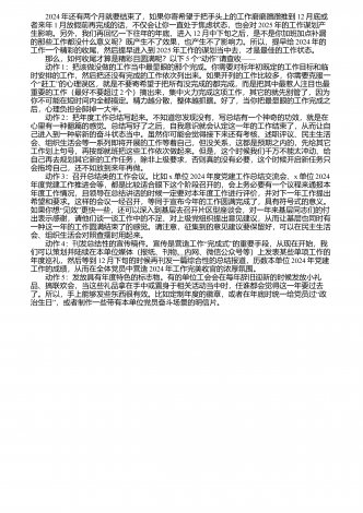 2024年还有两个月就要结束了,如果你寄希望于把手头上的工作磨磨蹭蹭推到12月底或者来年1月放假前再完成的话,不仅会让你一直处于焦虑状态,也会对2025年的工作谋划产生影响。另外,我们再回忆一下往年的年底,进入12月中下旬之后,是不是你加班加点补漏的那些工作都没什么意义呢?既产生不了效果,也产生不了影响力。所以,提早给2024年的工作一个精彩的收尾,然后提早进入到2025年工作的谋划当中去,才是最佳的工作状态。 那么,如何收尾才算是精彩且圆满呢?以下5“”——个动作请查收 动作1:把该做...