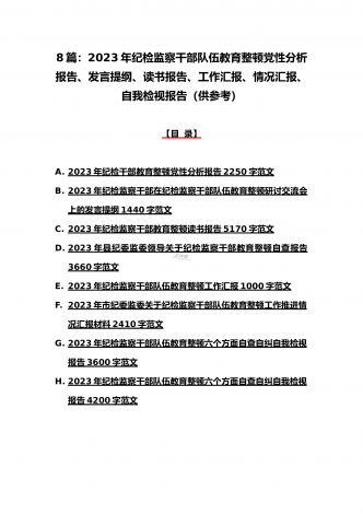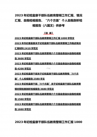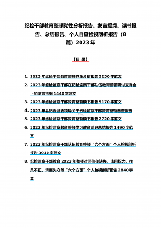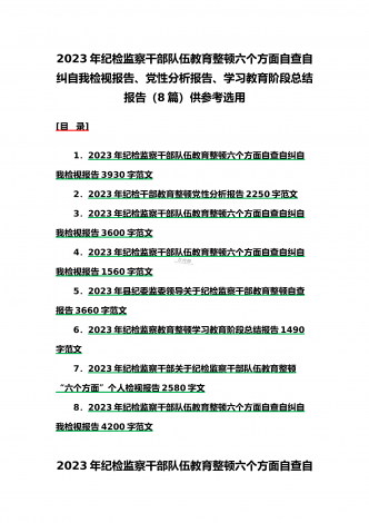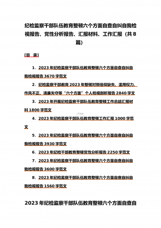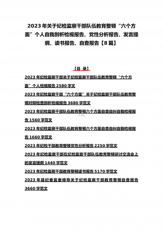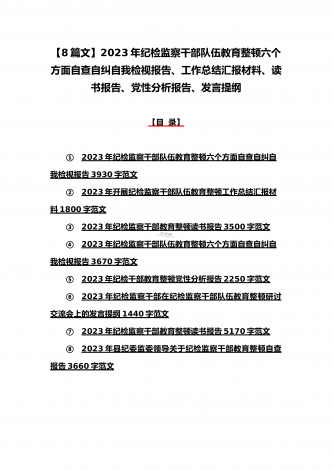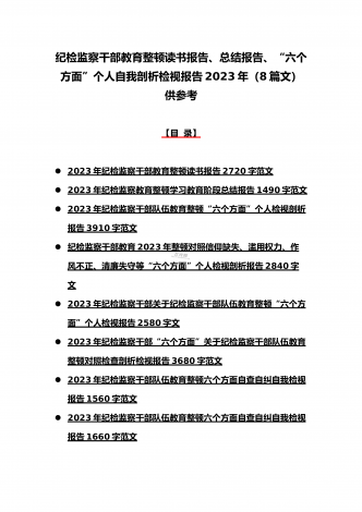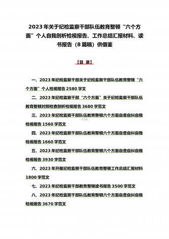 2023年纪检监察干部队伍教育整顿六个方面自查自纠自我检视报告、工作总结汇报材料、读书报告、总结报告、个人检视剖析报告(共8篇)可参考