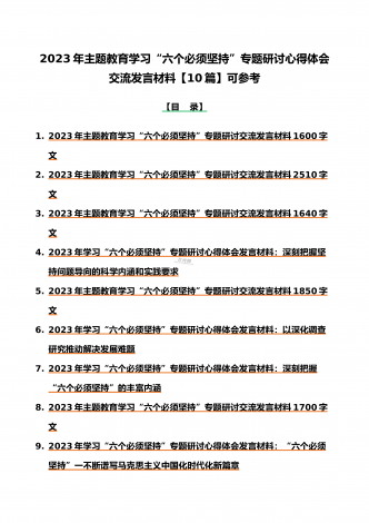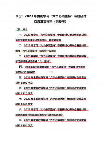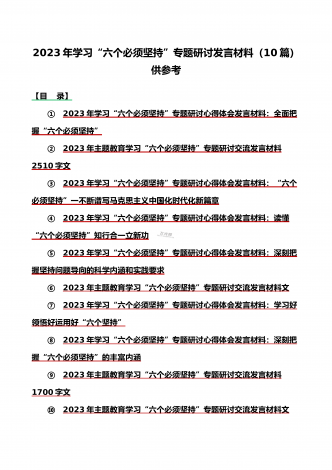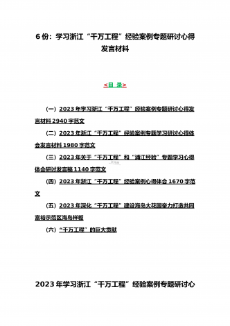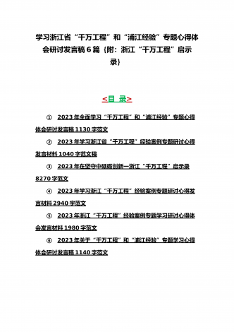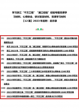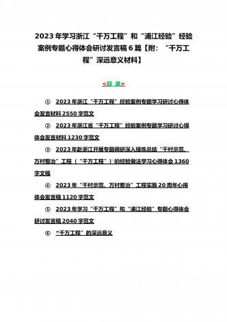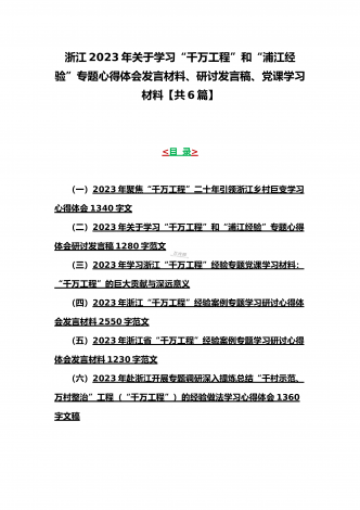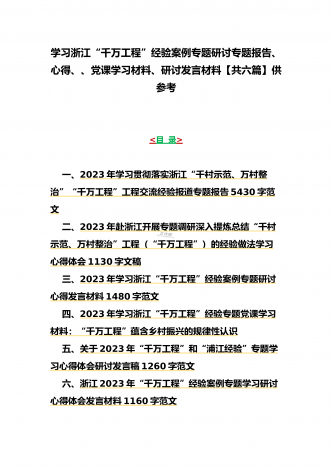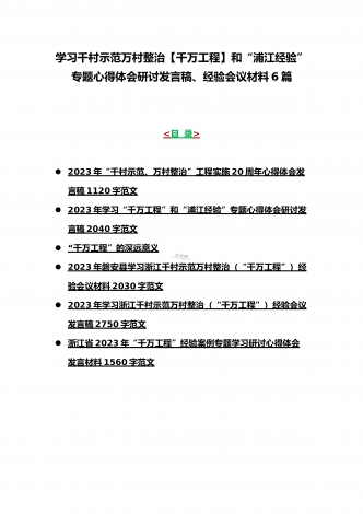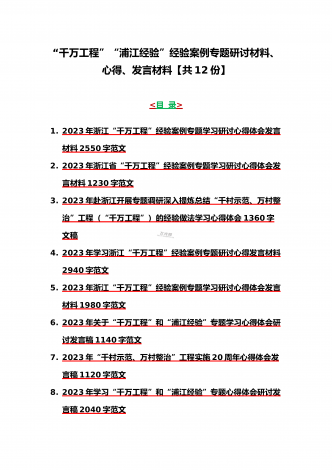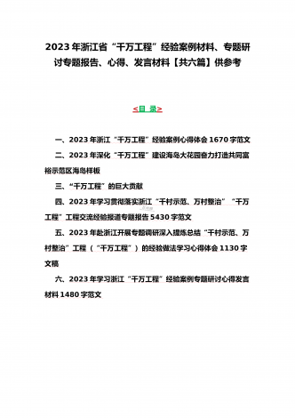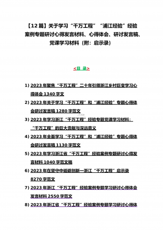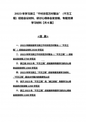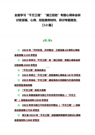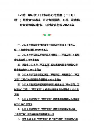 12篇:学习浙江千村示范万村整治(“千万工程”)经验会议材料、研讨专题报告、心得、发言稿、专题党课学习材料、研讨发言材料2023年<目录>一、2023年磐安县学习浙江千村示范万村整治(“千万工程”)经验会议材料2030字范文二、2023年学习浙江千村示范万村整治(“千万工程”)经验会议发言稿2750字范文三、浙江省2023年“千万工程”经验案例专题学习研讨心得体会发言材料1560字范文四、2023年学习贯彻落实浙江“千村示范、万村整治”“千万工程”工程交流经验报道专题报告5430字范文五、202...