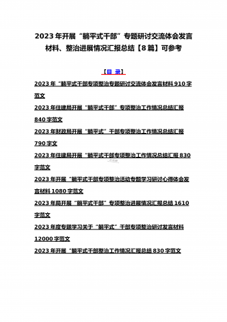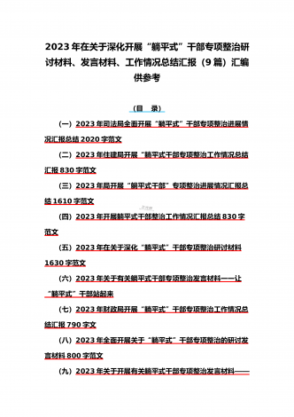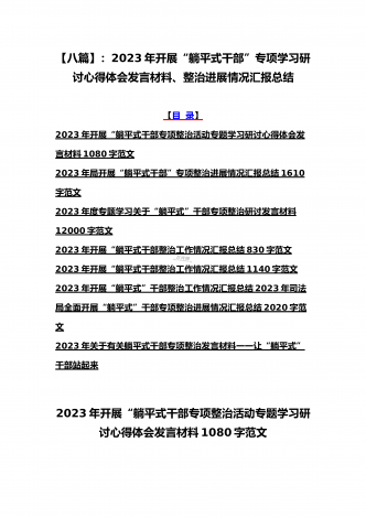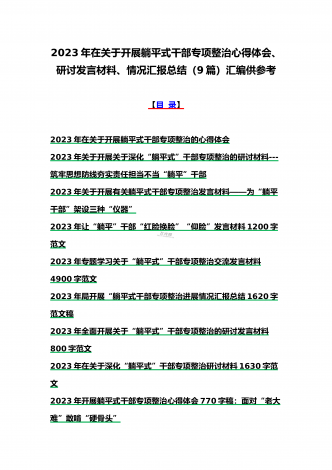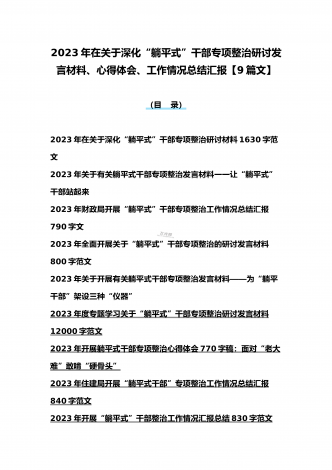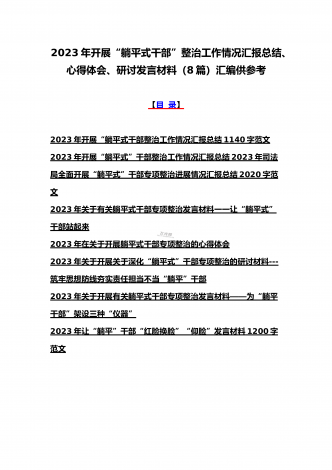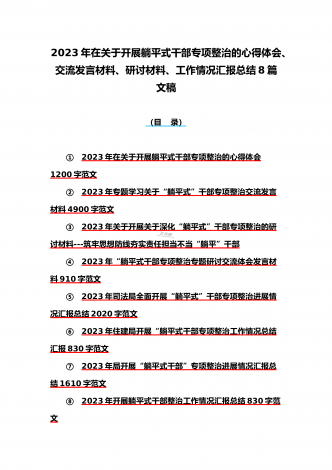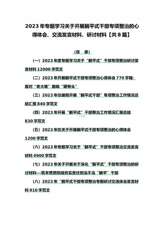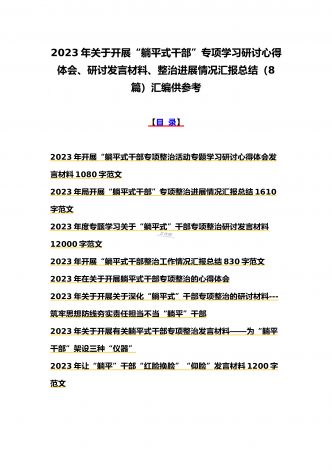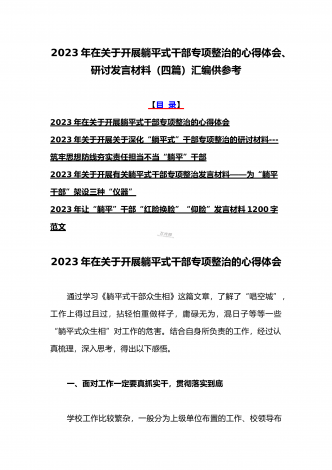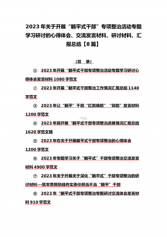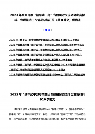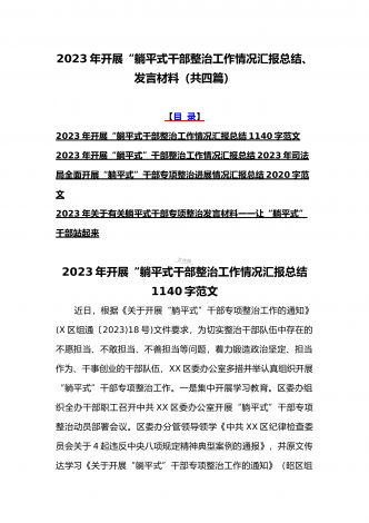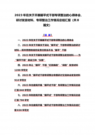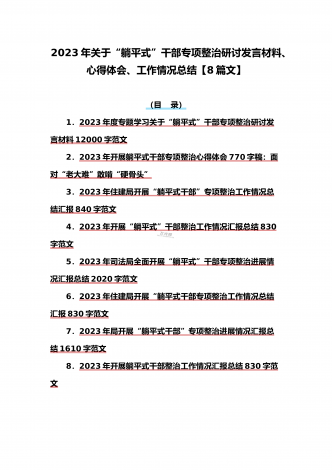 2023年关于开展“躺平式干部”专项整治活动专题学习研讨的心得体会、交流发言材料、研讨材料、汇报总结【8篇】(目录)① 2023年开展“躺平式干部专项整治活动专题学习研讨心得体会发言材料1080字范文② 2023年开展“躺平式干部整治工作情况汇报总结1140字范文③ 2023年让“躺平”干部“红脸换脸”“仰脸”发言材料1200字范文④ 2023年局开展“躺平式干部专项整治进展情况汇报总结1620字范文稿⑤ 2023年在关于开展躺平式干部专项整治的心得体会1200字范文⑥ 2023年专题学习关于“...