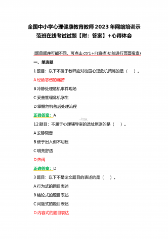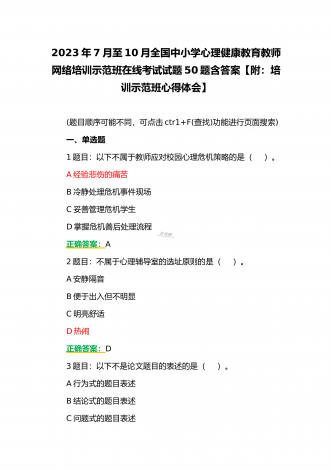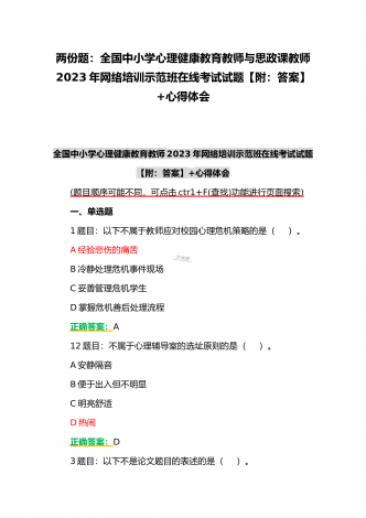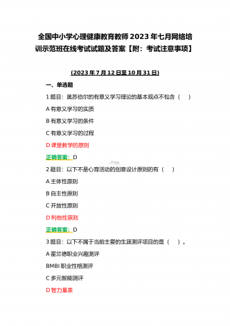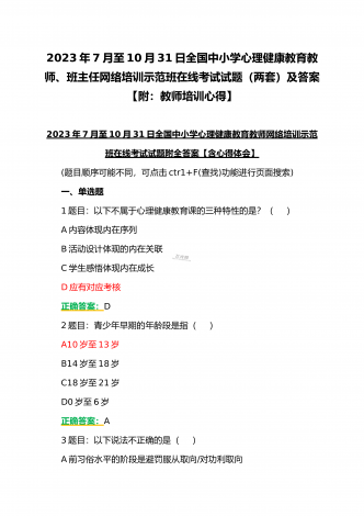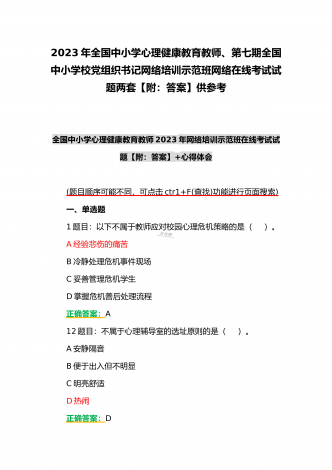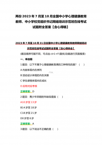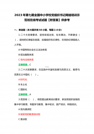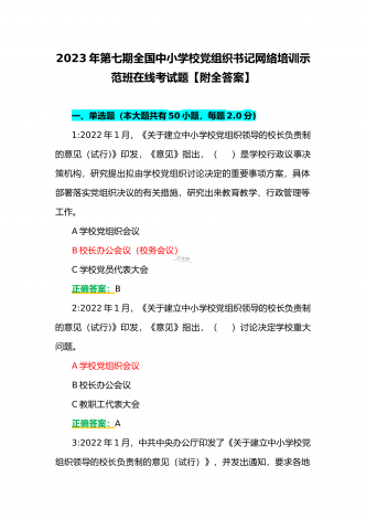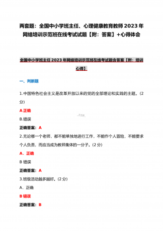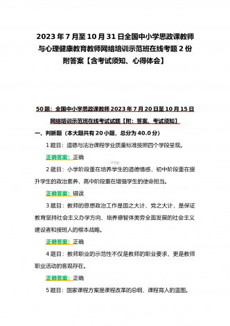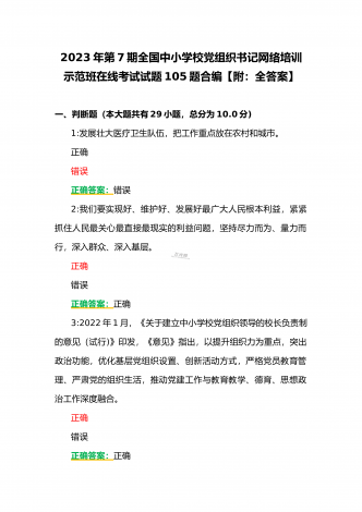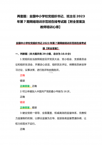 (合编两套题)全国中小学校党组织书记与思政课教师2023年第7期网络培训示范班在线考试题【附全答案、考试须知】(7月20日至10月15日)全国中小学校党组织书记2023年第7期网络培训示范班在线考试题【附全答案】一、判断题(本大题共有29小题,总分为10.0分)1:党组织应当按照规定召开党员大会、党小组会、支部委员会议和组织生活会,开展谈心谈话,组织民主评议,保障党员参加学习讨论,议事决策,进行批评和自我批评。正确错误正确答案:正确2:可以申请加入中国共产党的最小年龄为16岁。正确错误正确答案:...