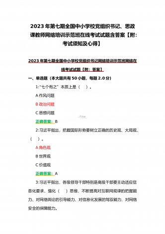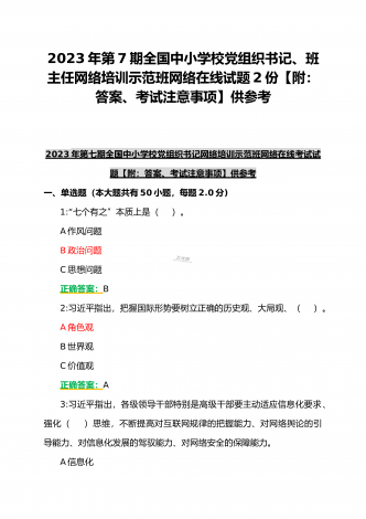(合编两套题)全国中小学校党组织书记与思政课教师2023年第7期网络培训示范班在线考试题【附全答案、考试须知】(7月20日至10月15日)