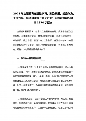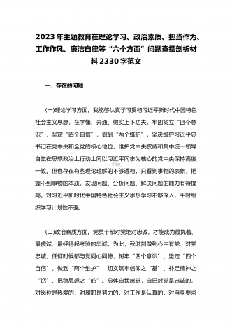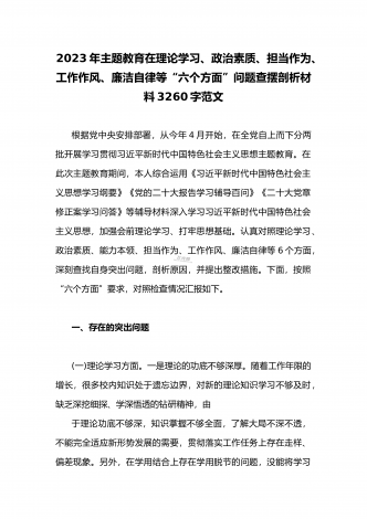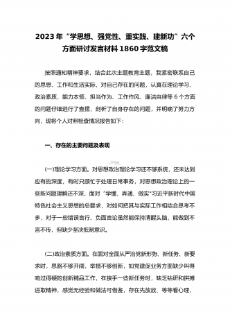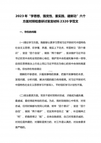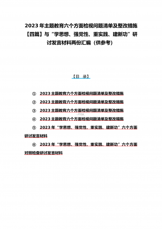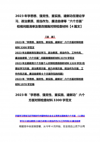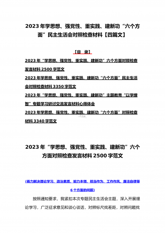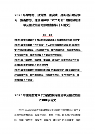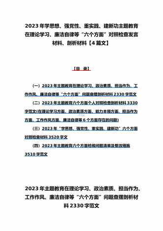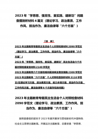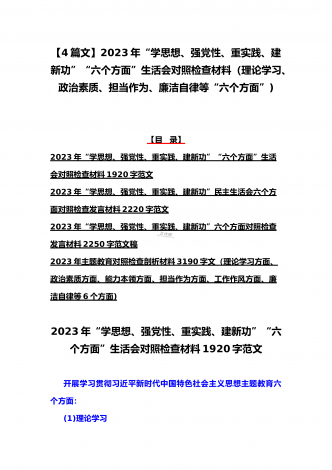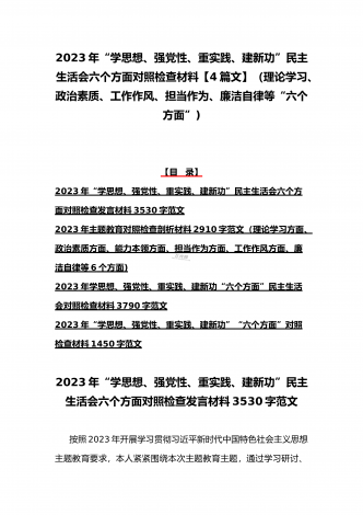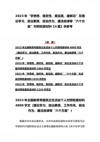 2023年“学思想、强党性、重实践、建新功”民主生活会六个方面对照检查材料【4篇文】(理论学习、政治素质、工作作风、担当作为、廉洁自律等“六个方面”)【目录】2023年“学思想、强党性、重实践、建新功”民主生活会六个方面对照检查发言材料3530字范文2023年主题教育对照检查剖析材料2910字范文(理论学习方面、政治素质方面、能力本领方面、担当作为方面、工作作风方面、廉洁自律等6个方面)2023年学思想、强党性、重实践、建新功“六个方面”民主生活会对照检查材料3790字范文2023年“学思想、强...