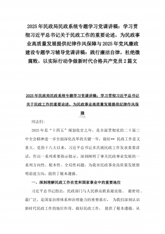 2025年民政局民政系统专题学习党课讲稿:学习贯彻习近平总书记关于民政工作的重要论述,为民政事业高质量发展提供纪律作风保障与2025年党风廉政建设专题学习辅导党课讲稿:践行廉洁自律,杜绝微腐败,以实际行动争做新时代合格共产党员2篇文