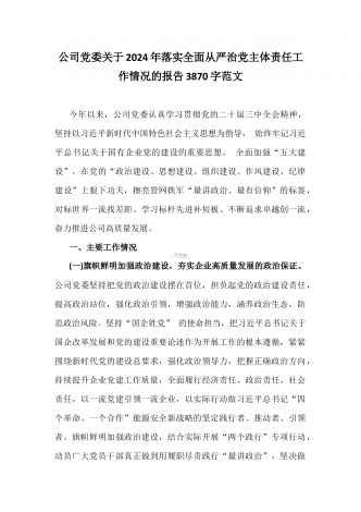 公司党委关于2024年落实全面从严治党主体责任工作情况的报告3870字范文