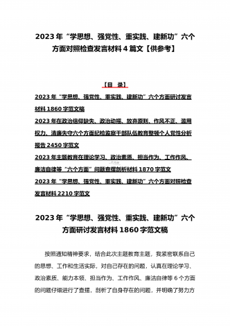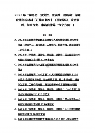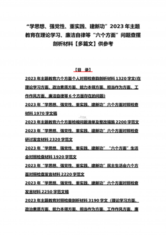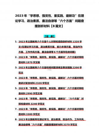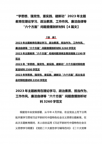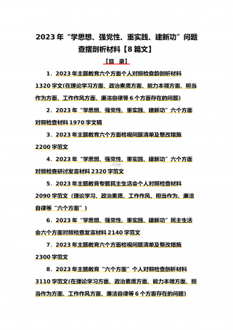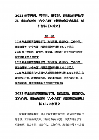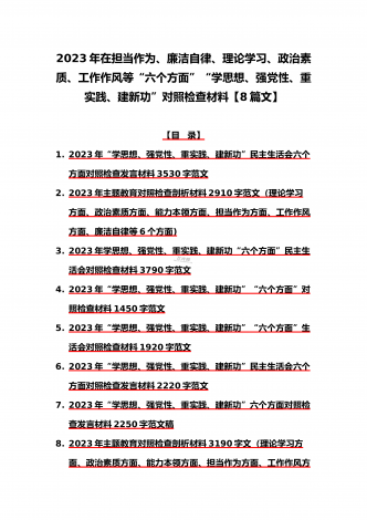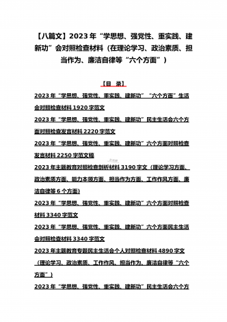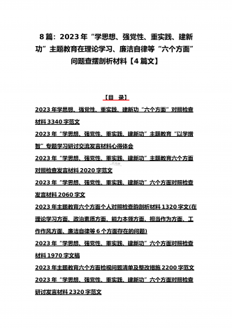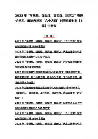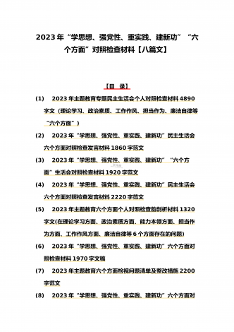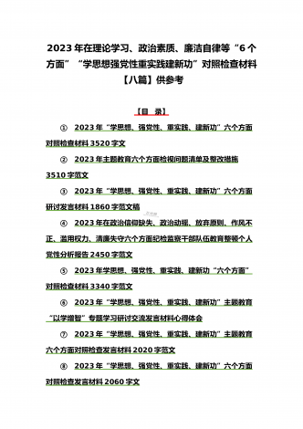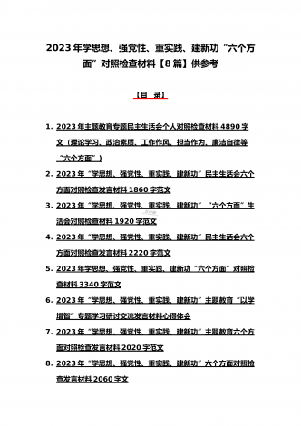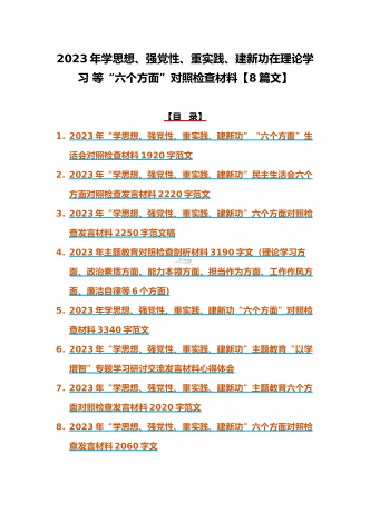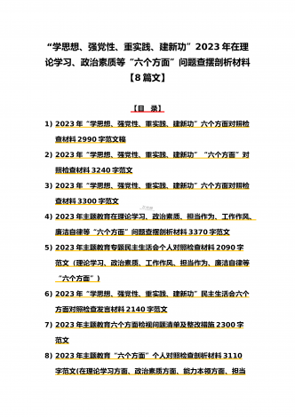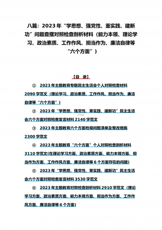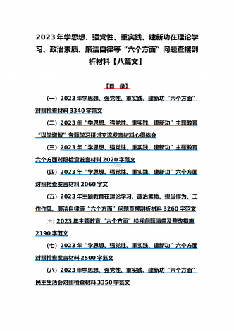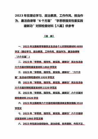 八篇:2023年“学思想、强党性、重实践、建新功”问题查摆对照检查剖析材料(能力本领、理论学习、政治素质、工作作风、担当作为、廉洁自律等“六个方面”)【目录】① 2023年主题教育专题民主生活会个人对照检查材料2090字范文(理论学习、政治素质、工作作风、担当作为、廉洁自律等“六个方面”)② 2023年“学思想、强党性、重实践、建新功”民主生活会六个方面对照检查发言材料2140字范文③ 2023年主题教育六个方面检视问题清单及整改措施2300字范文④ 2023年主题教育“六个方面”个人对照检查剖...