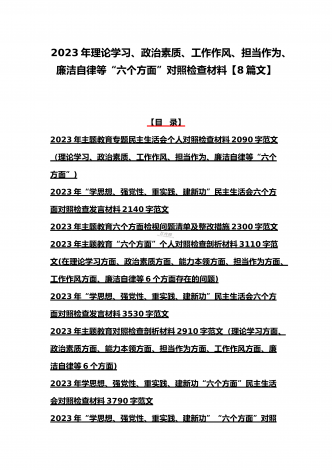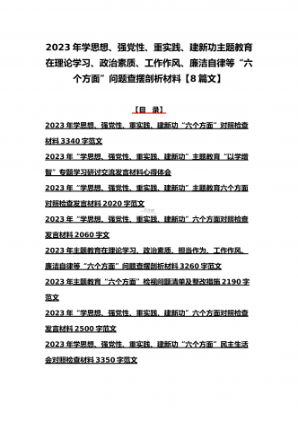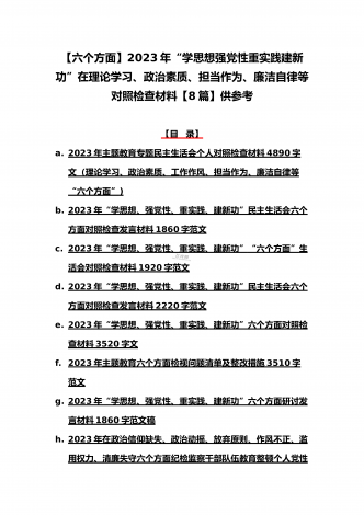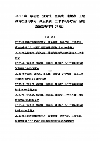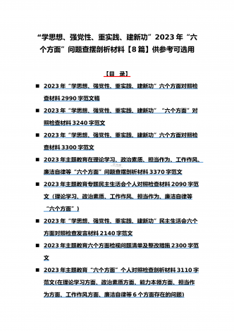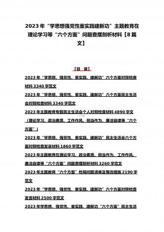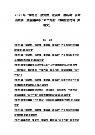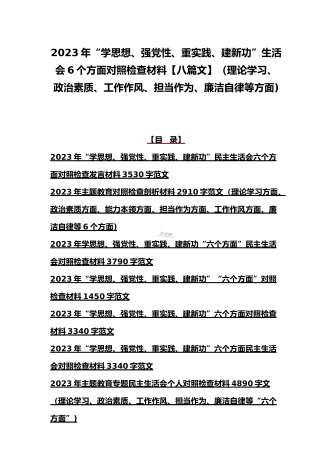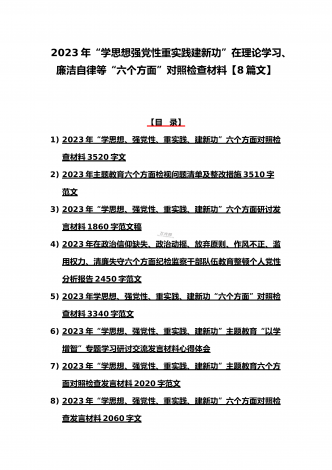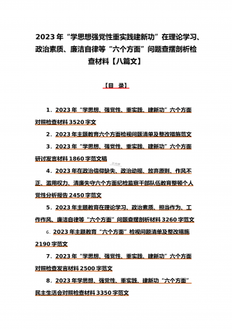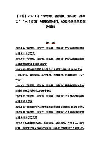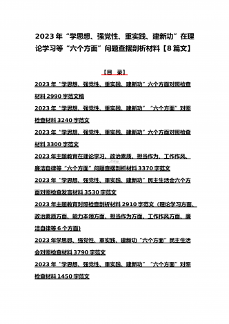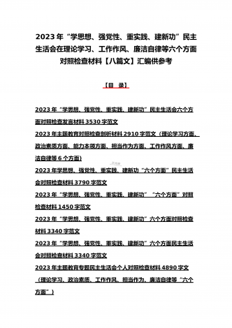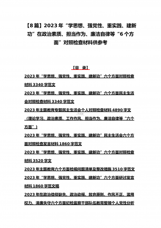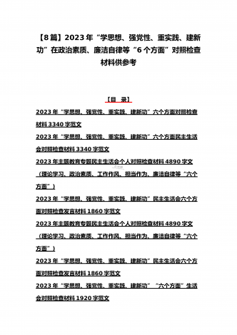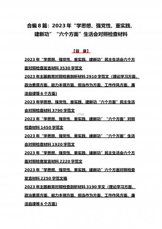 2023年“学思想、强党性、重实践、建新功”生活会6个方面对照检查材料【八篇文】(理论学习、政治素质、工作作风、担当作为、廉洁自律等方面)【目录】2023年“学思想、强党性、重实践、建新功”民主生活会六个方面对照检查发言材料3530字范文2023年主题教育对照检查剖析材料2910字范文(理论学习方面、政治素质方面、能力本领方面、担当作为方面、工作作风方面、廉洁自律等6个方面)2023年学思想、强党性、重实践、建新功“六个方面”民主生活会对照检查材料3790字范文2023年“学思想、强党性、重实践...