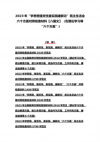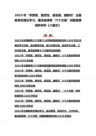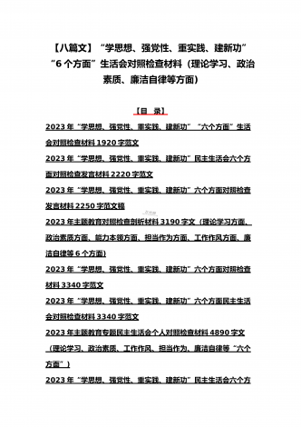 2023年“学思想、强党性、重实践、建新功”生活会6个方面对照检查材料【八篇文】(理论学习、政治素质、工作作风、担当作为、廉洁自律等方面)