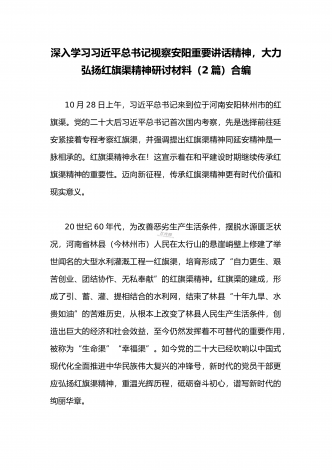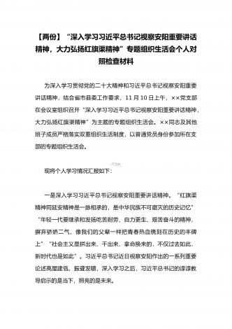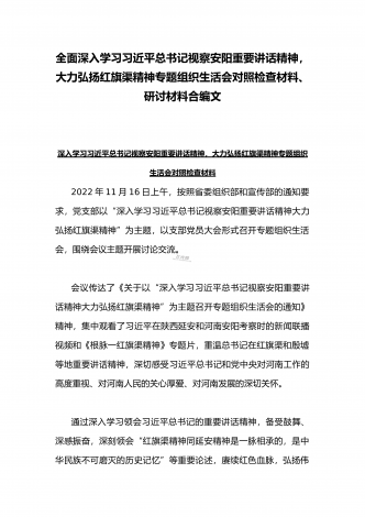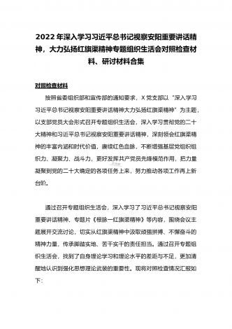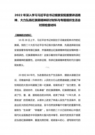2022年全面深入学习习近平总书记视察安阳重要讲话精神,大力弘扬红旗渠精神专题组织生活会对照检查材料(两篇文)按照省委组织部和宣传部的通知要求,X党支部以“深入学习习近平总书记视察安阳重要讲话精神大力弘扬红旗渠精神”为主题,以支部党员大会形式召开专题组织生活会,深入学习贯彻党的二十大精神和习近平总书记视察安阳重要讲话精神,深刻领会红旗渠精神的丰富内涵和时代价值,赓续红色血脉,不断增强基层党组织组织力、凝聚力、战斗力,更好发挥共产党员先锋模范作用,把力量凝聚到党的二十大确定的各项任务上来,努力推动...